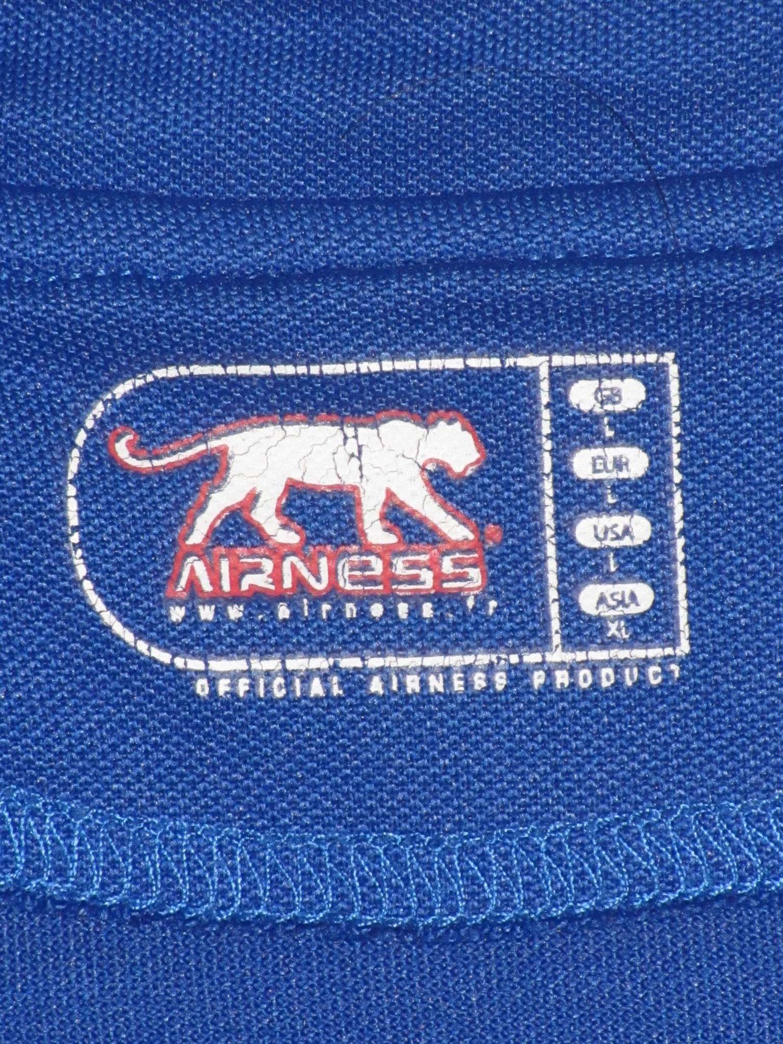 Het geborduurde club embleem is opgenaaid. De Airness, de sponsorvermeldingen, de rugnummer en de spelersnaam zijn plastic heat pressed prints, waarvan enkele zeer kleine kreukjes hebben door het verschil in elasticiteit met het shirt materiaal.