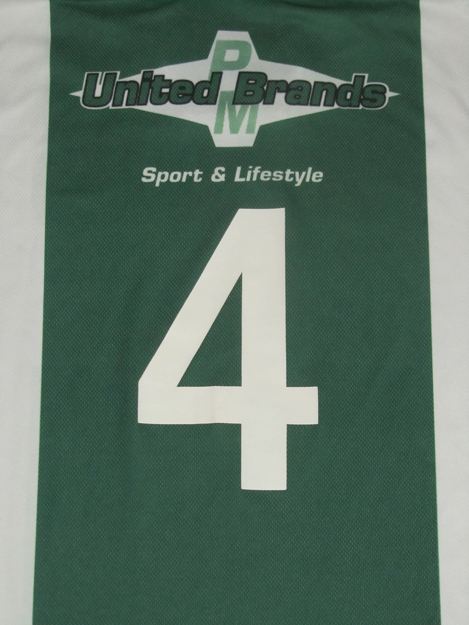Het club embleem met verwijzing naar het 100-jarig bestaan, de UB Sport en de sponsor vermeldingen zijn in het shirt geprint. De rugnummer is een plastic heat pressed print.