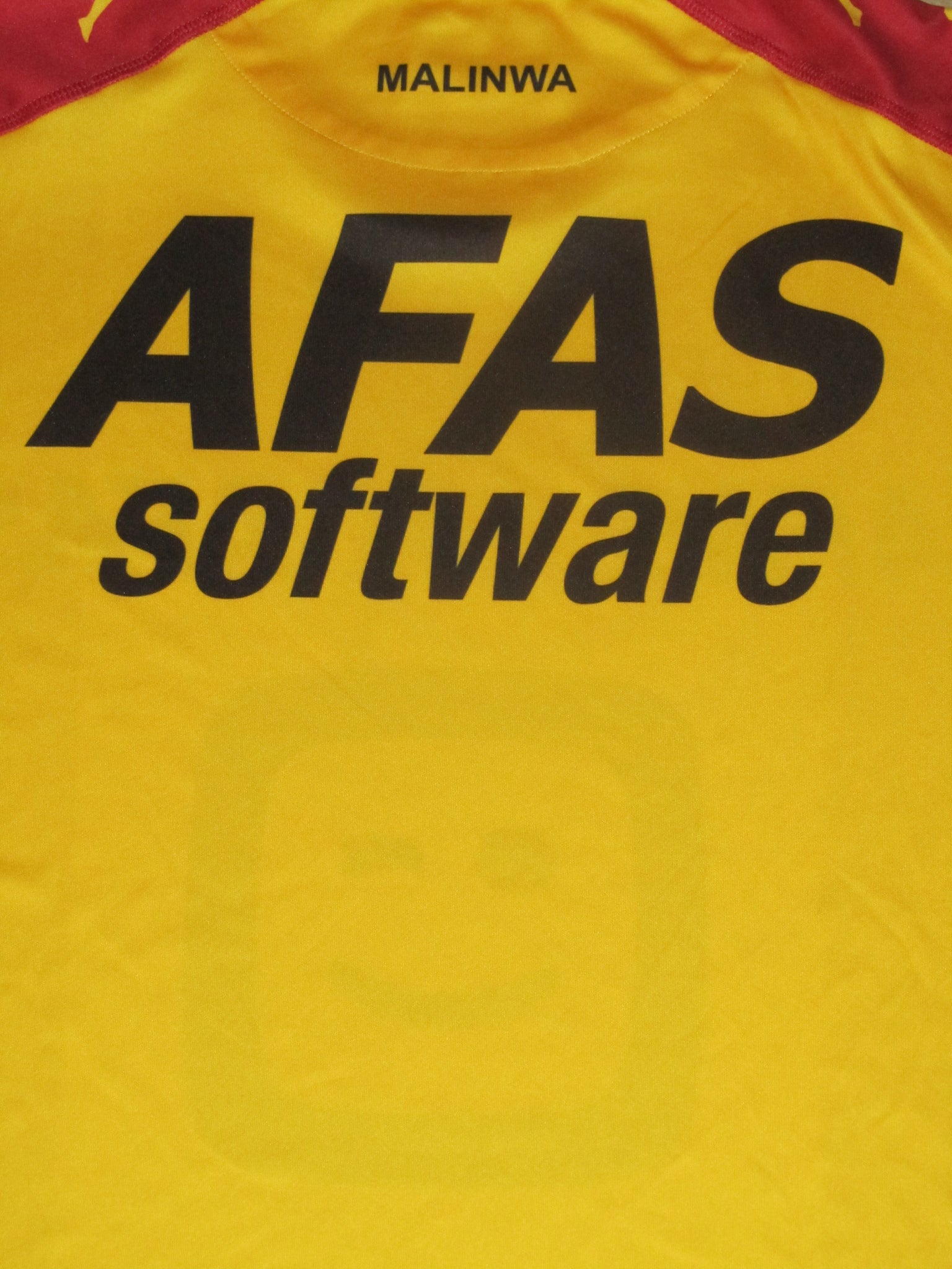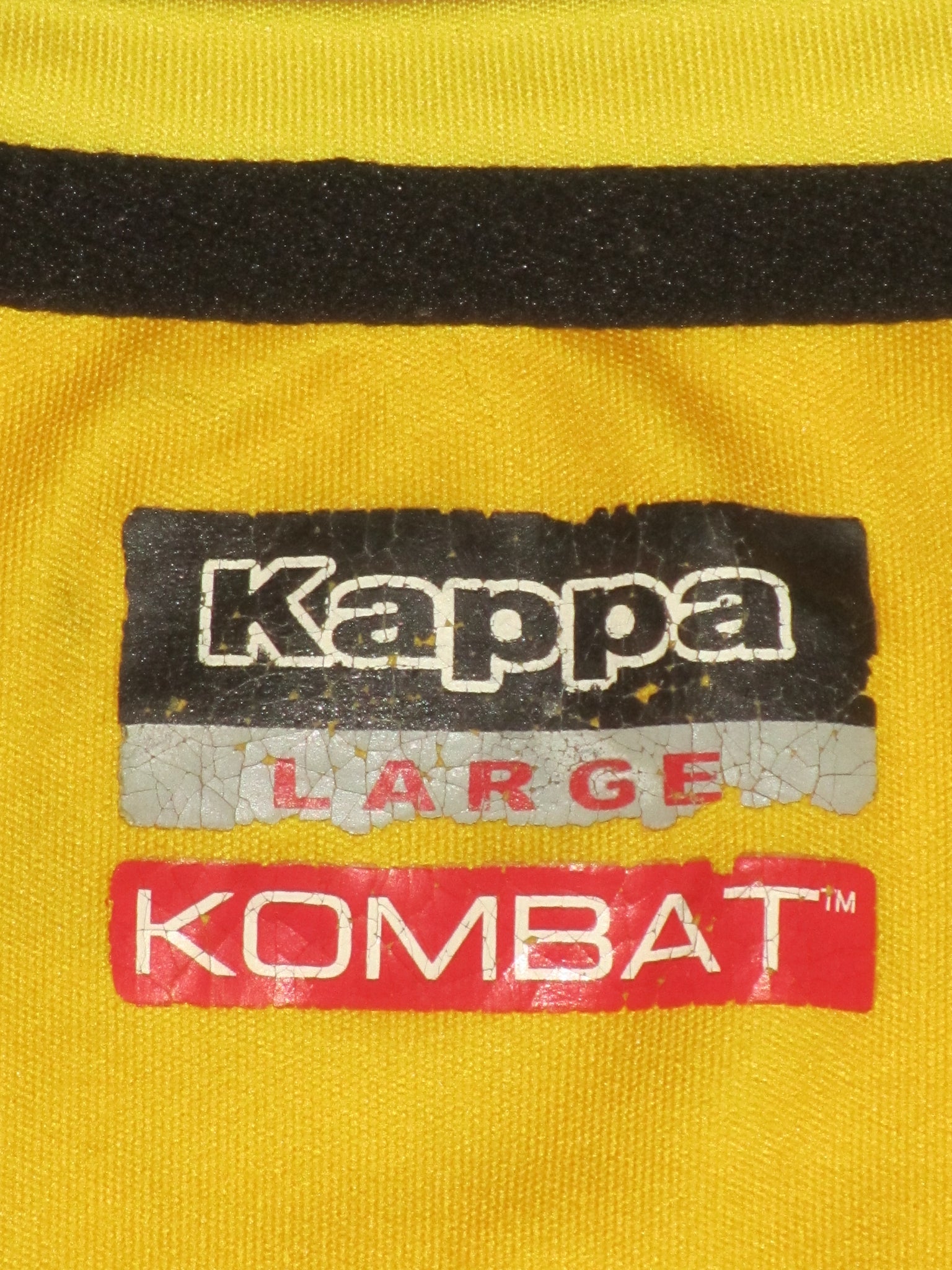 Enkele kleine vlekjes onder de telenet.be vermelding aan de voorzijde. Het maatlabel aan de binnenkant van het shirt is verweerd. Het club embleem, de Kappa en de sponsorvermeldingen zijn in het shirt geprint.