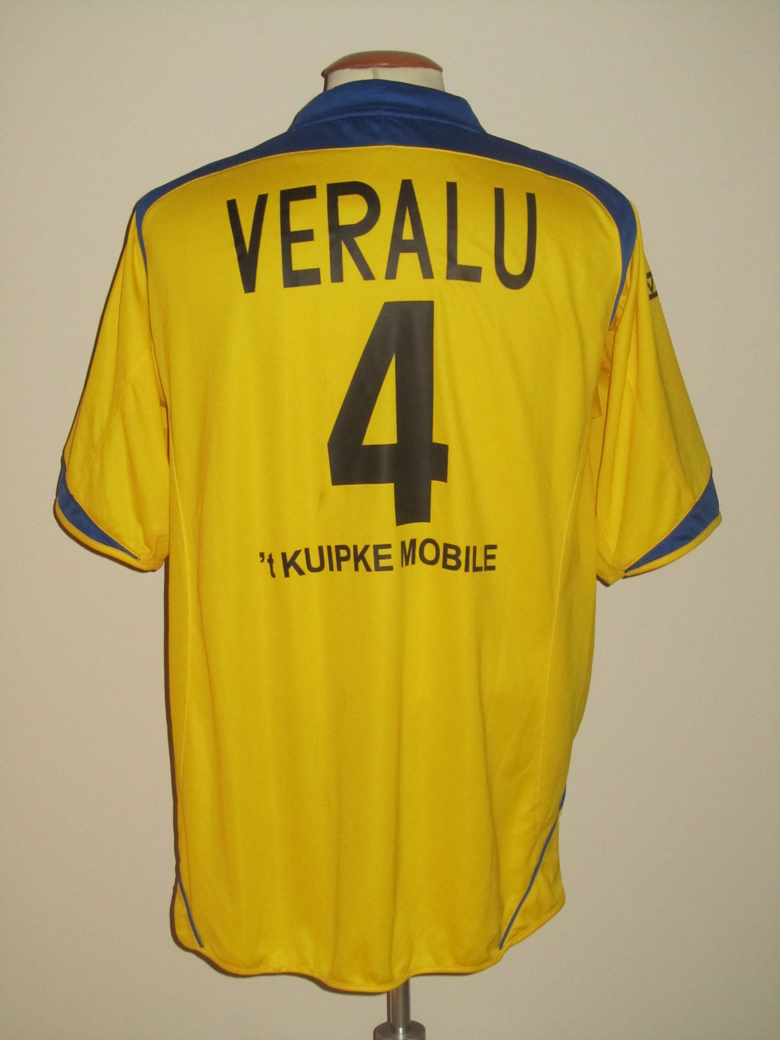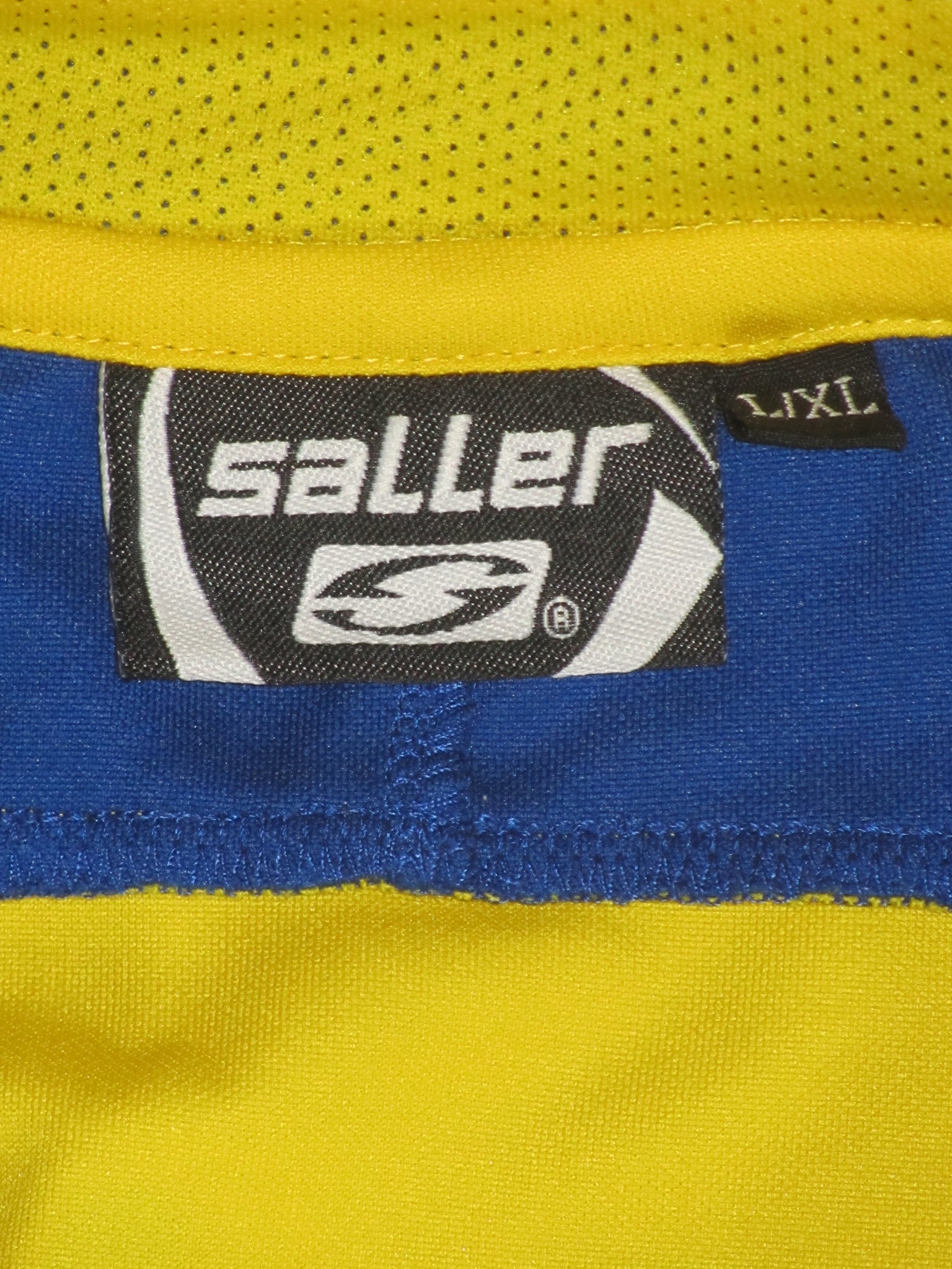 Enkele lichte (wedstrijd?)vlekken. Het club embleem is een velourse flockage. De Saller en sponsor vermeldingen en de rugnummer zijn plastic heat pressed prints. De Saller garment label is opgenaaid.