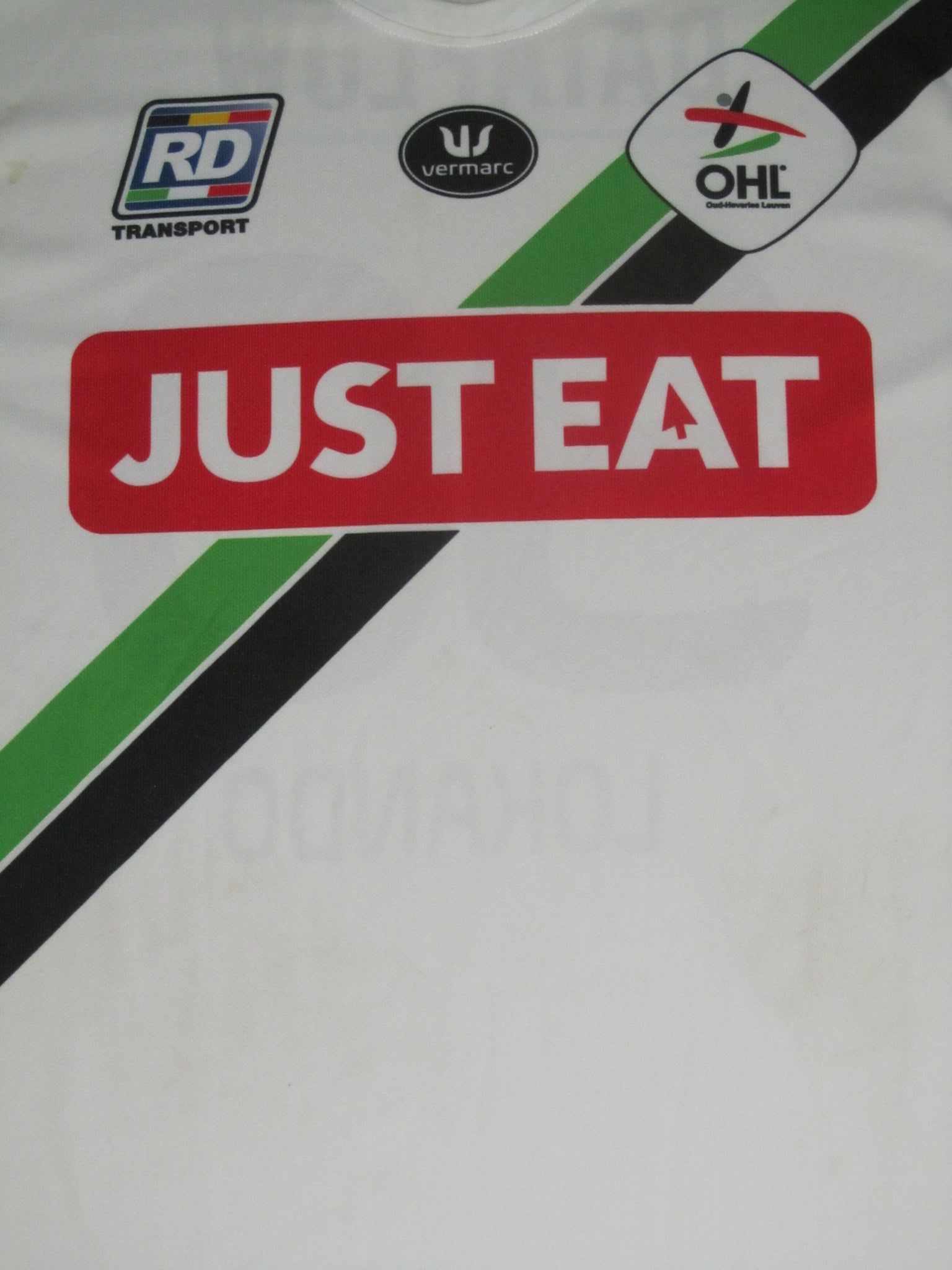Het shirt heeft zeer lichte (wedstrijd?) vlekjes. Het club embleem, de Vermarc- en de sponsorvermeldingen, de rugnummer en de spelersnaam zijn in het shirt geprint.