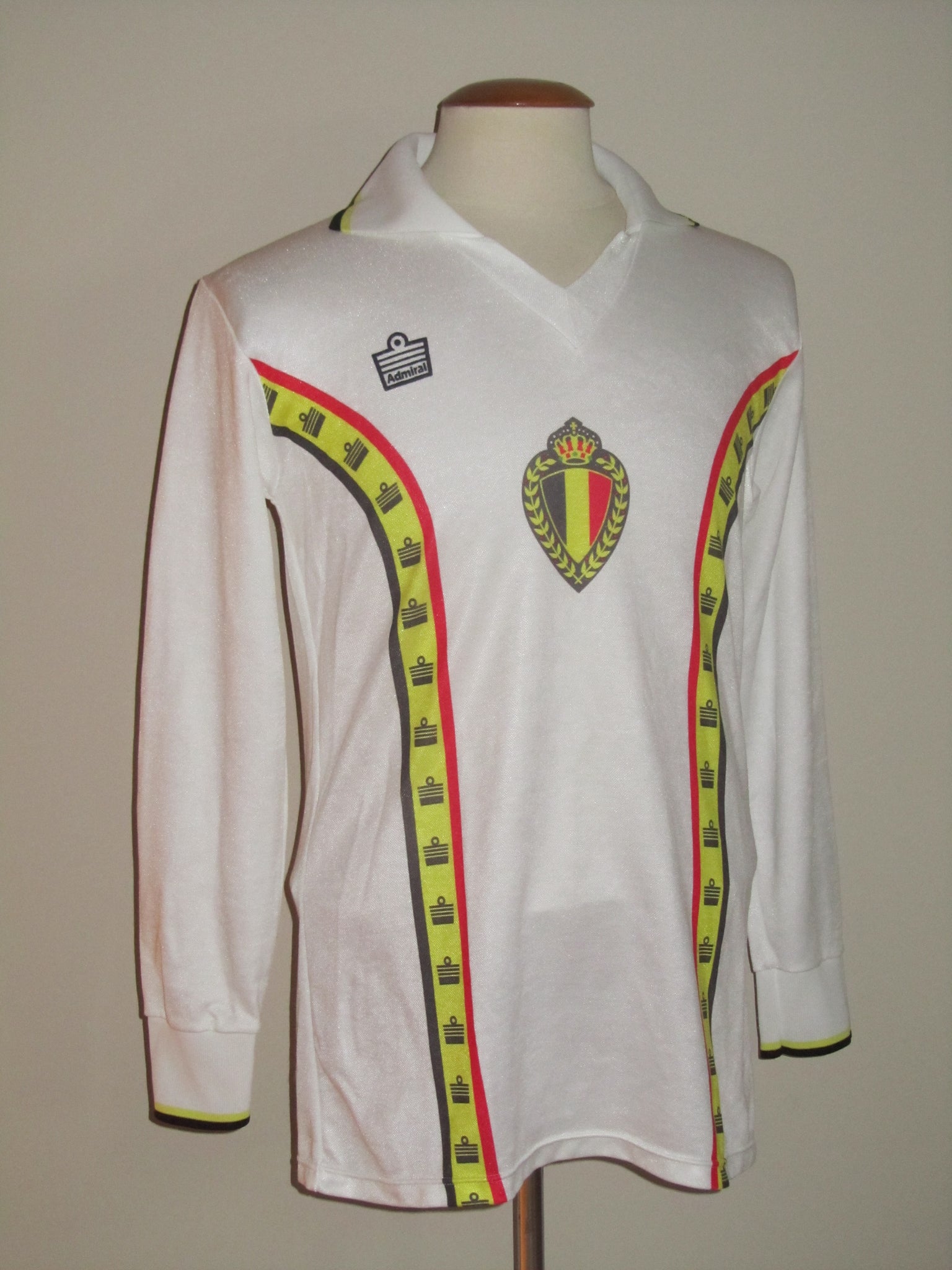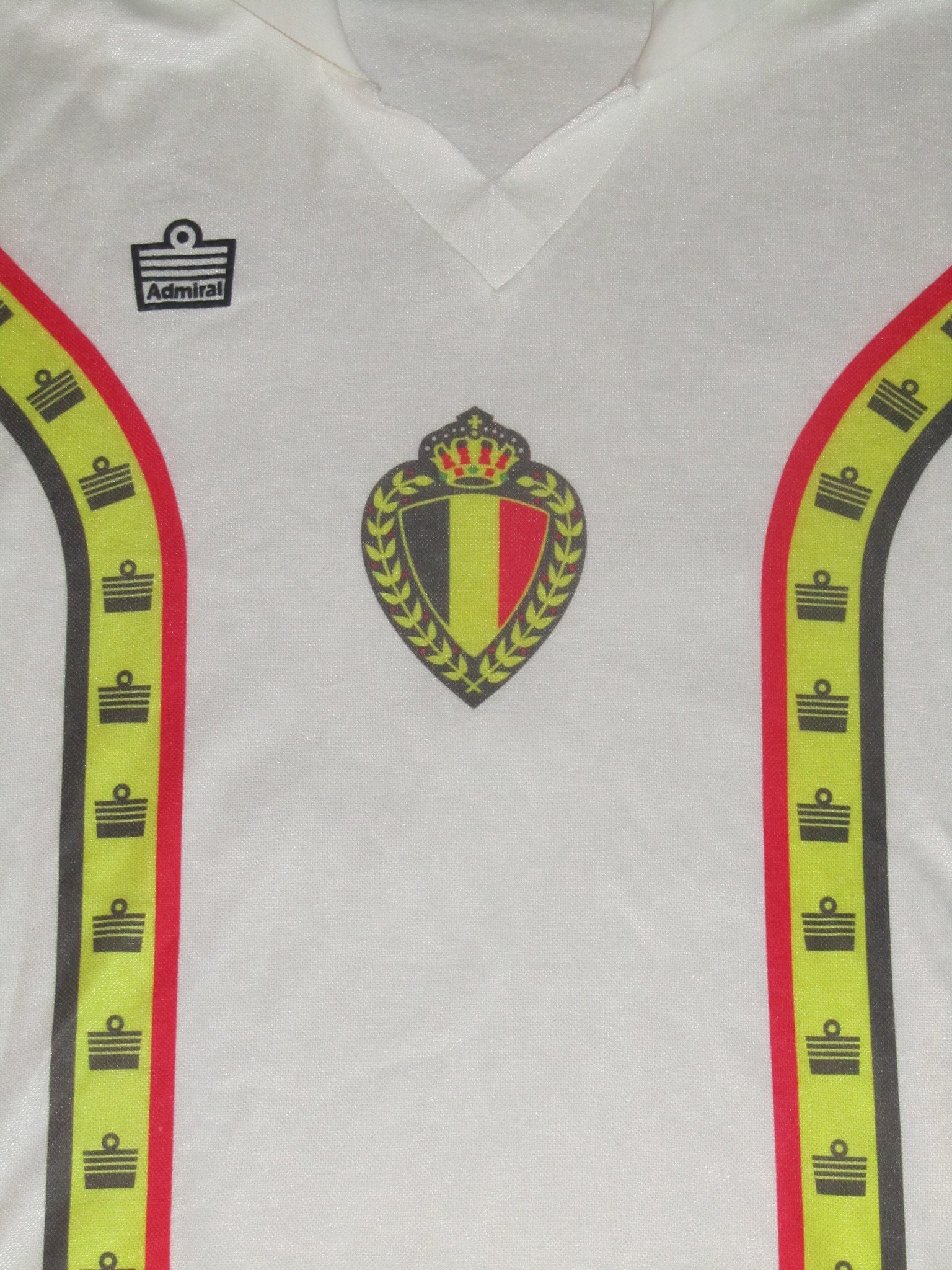 Iconisch "bretellen" shirt van het Engelse merk Admiral in de versie met een kraag, verondersteld klaargemaakt of gebruikt geweest te zijn door de Rode Duivels.