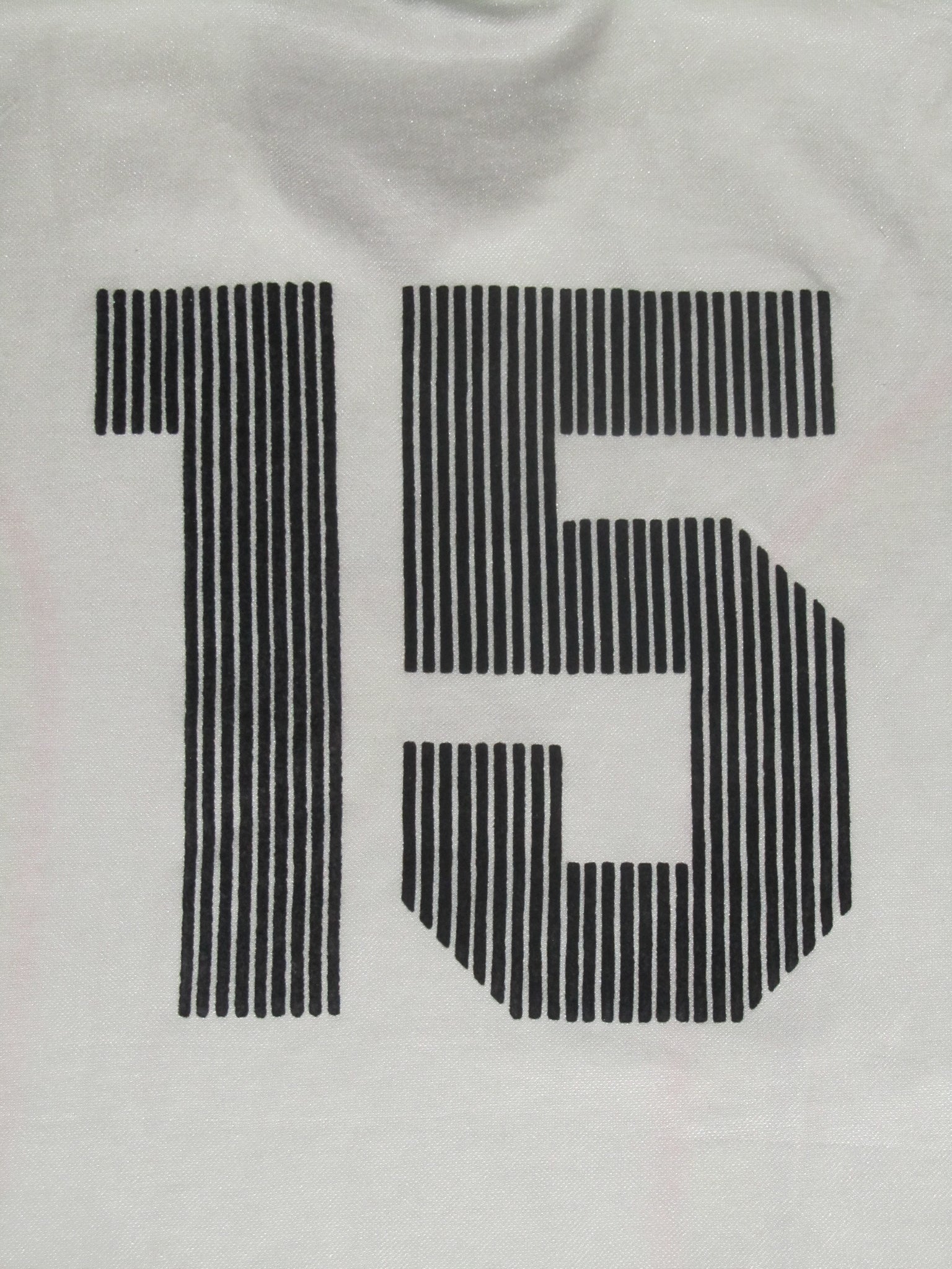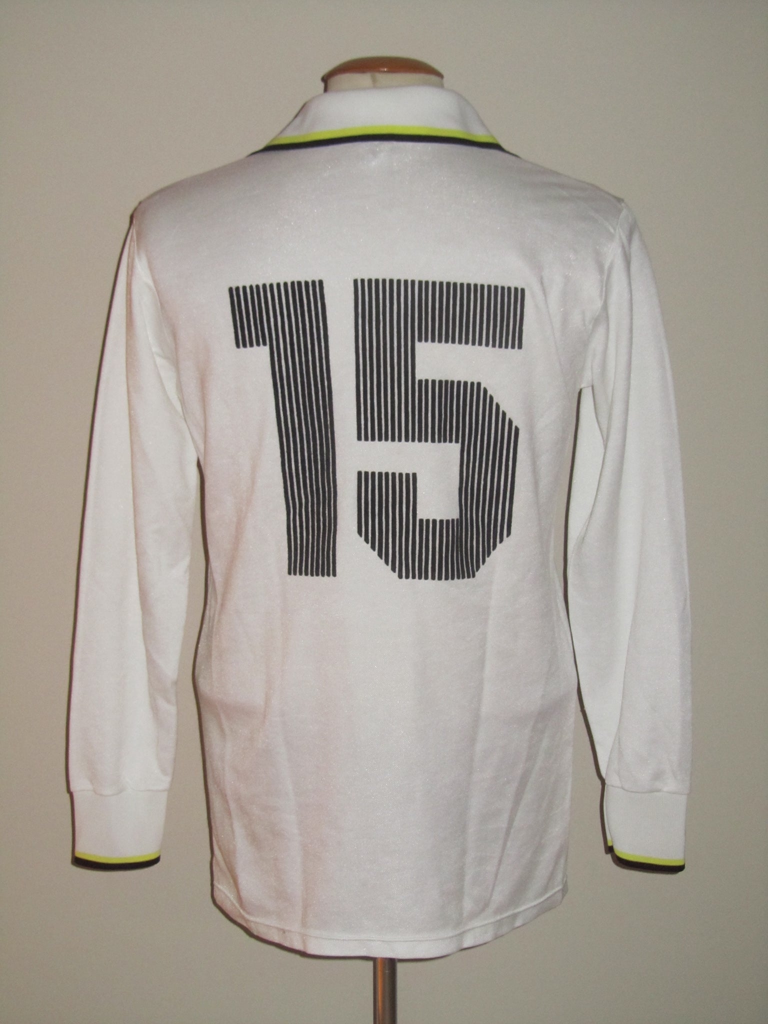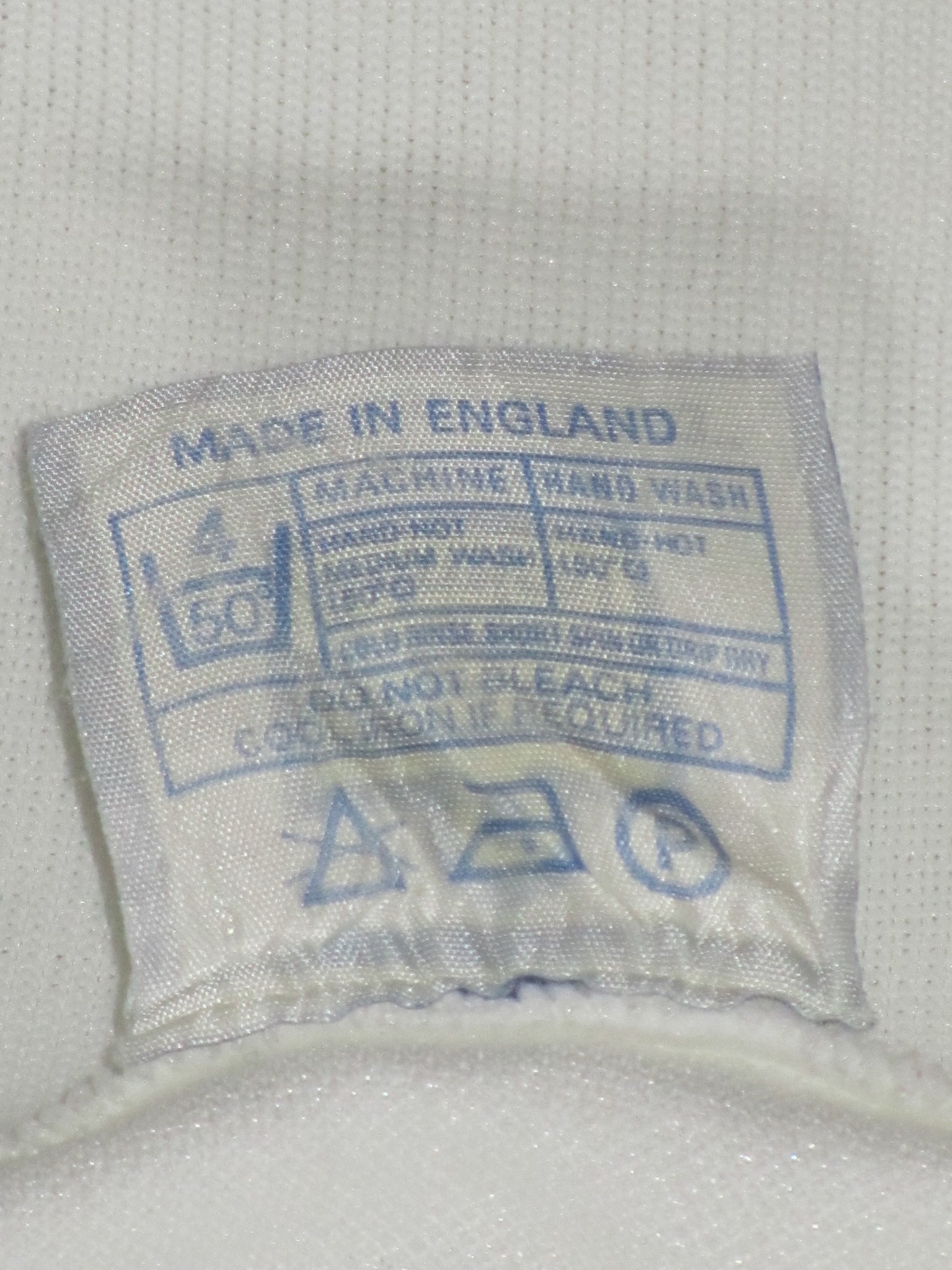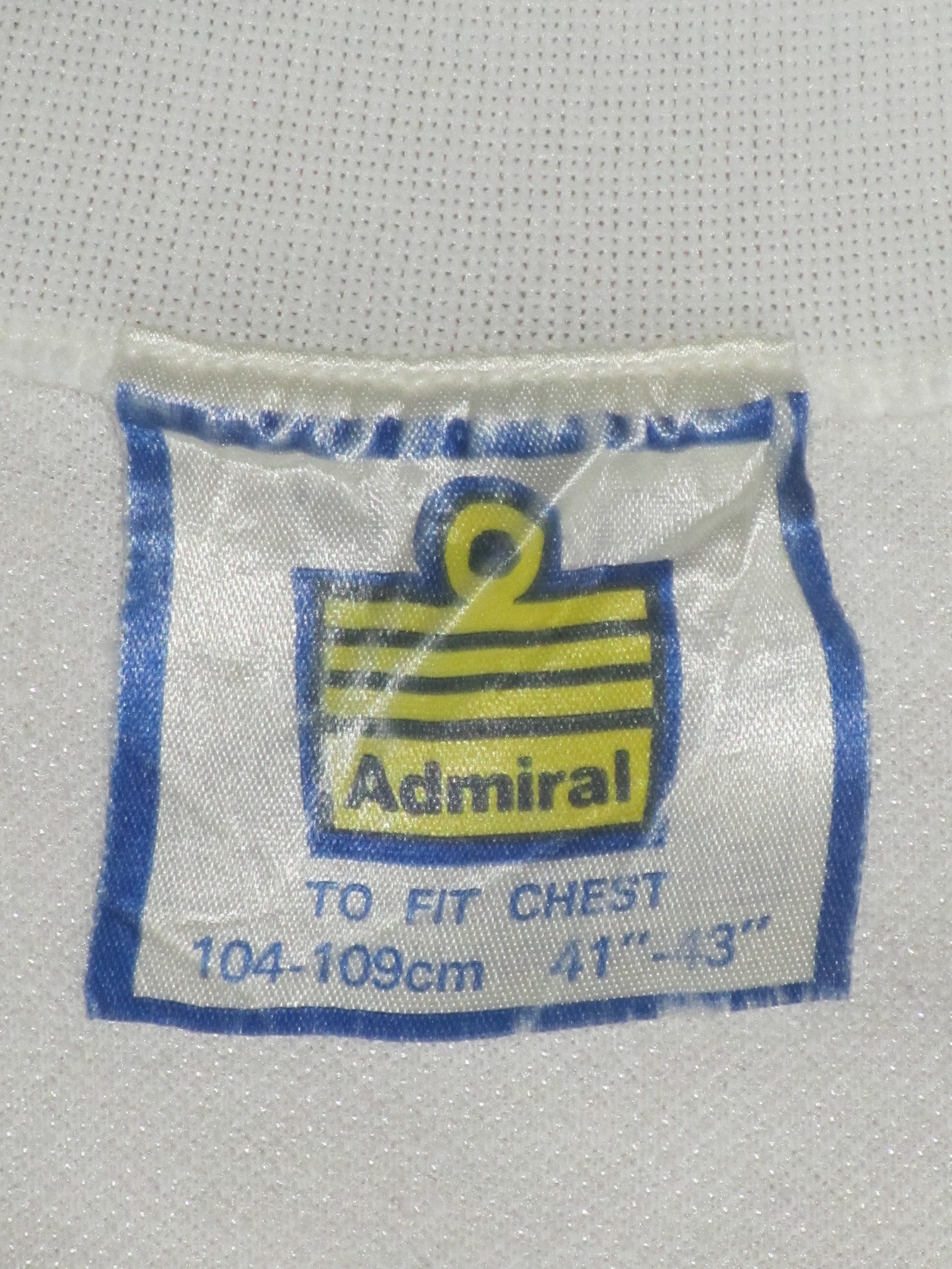 Het shirt heeft een aantal zeer kleine haakjes. Het Admiral logo en de rugnummer zijn intacte, velourse heat pressed flockages. Het tricolore embleem en de Admiral prints in de tricolore banden aan de voorzijde zijn in het shirt geprint. Het shirt heeft ondanks zijn ouderdom, frisse kleuren.