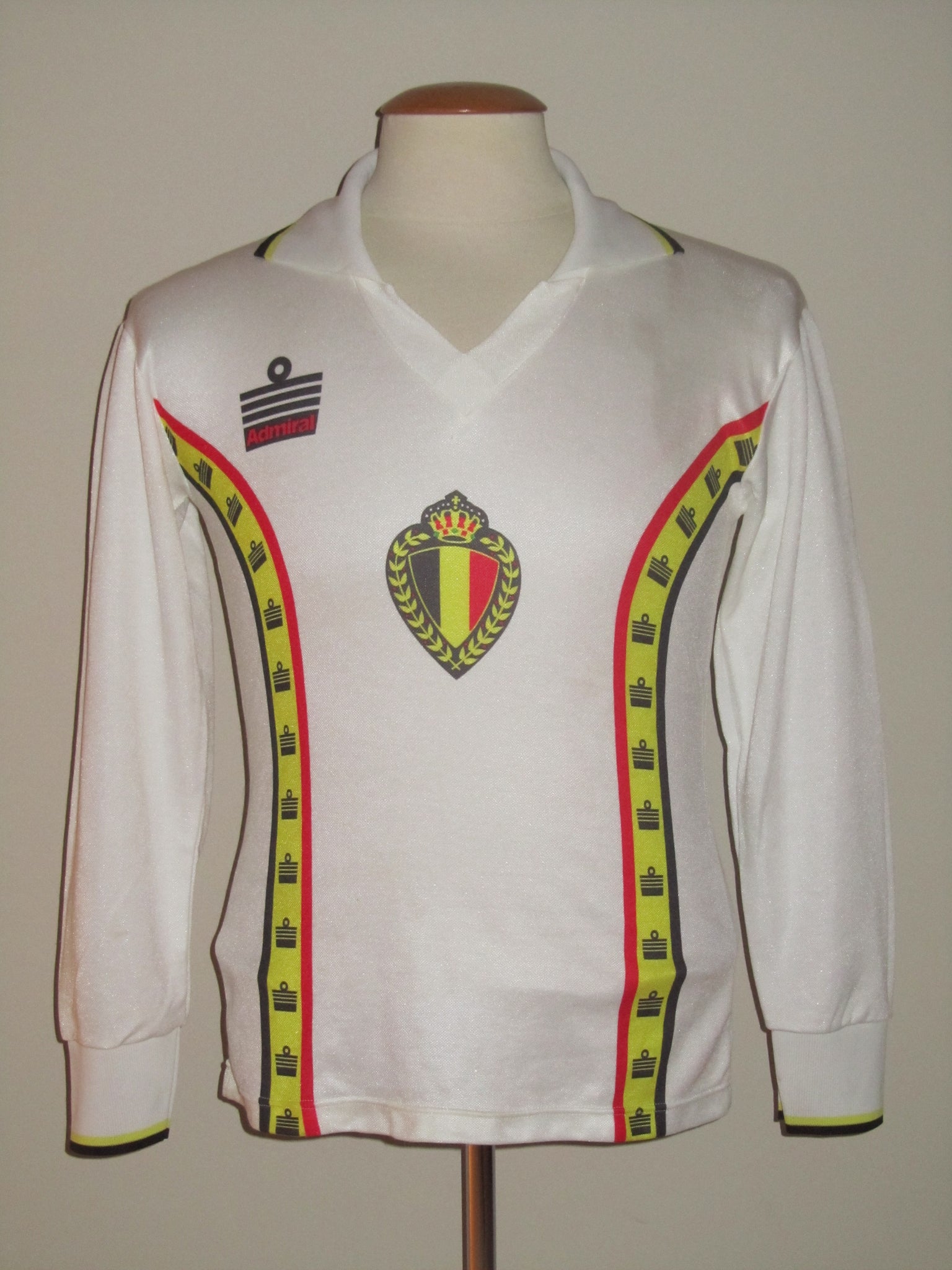 Iconisch "bretellen" shirt van het Engelse merk Admiral in de versie met een kraag, verondersteld klaargemaakt of gebruikt geweest te zijn door de Rode Duivels.