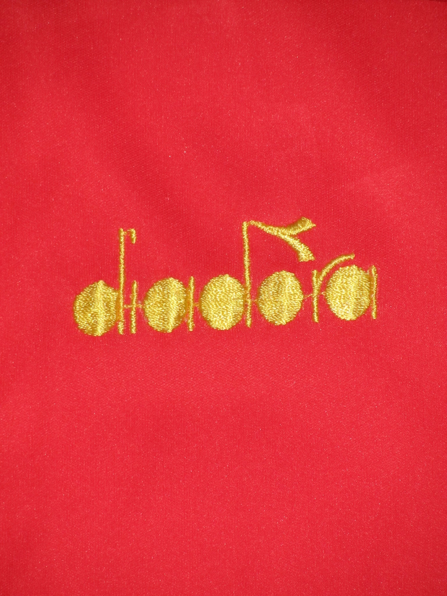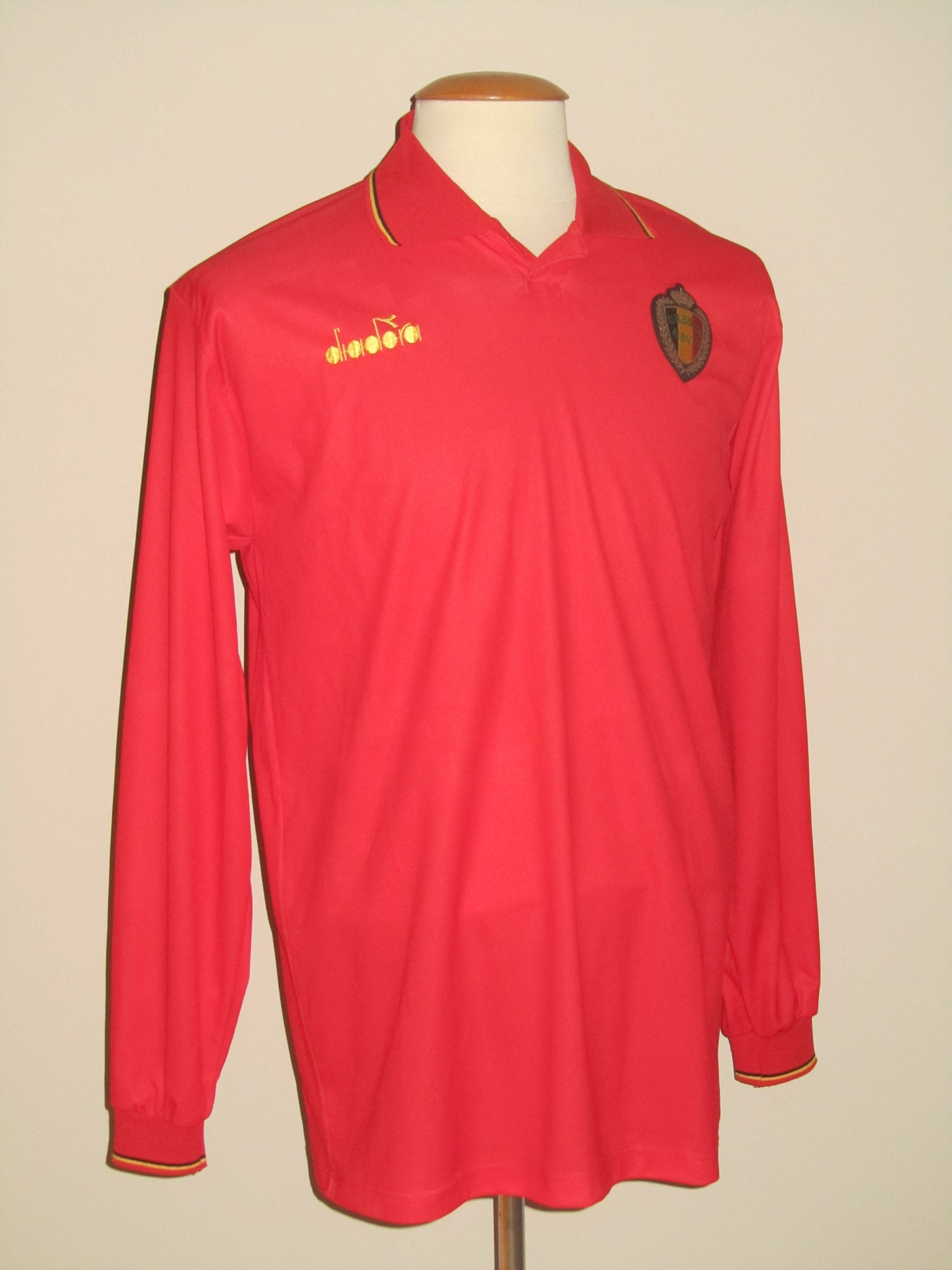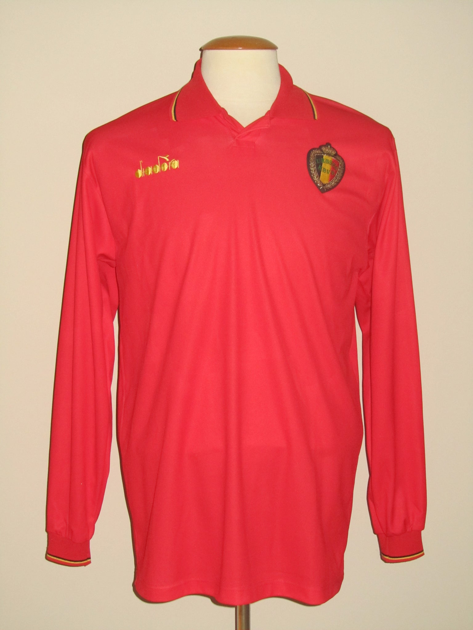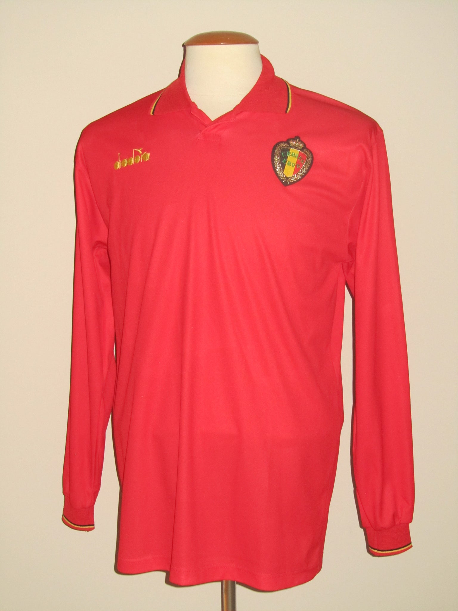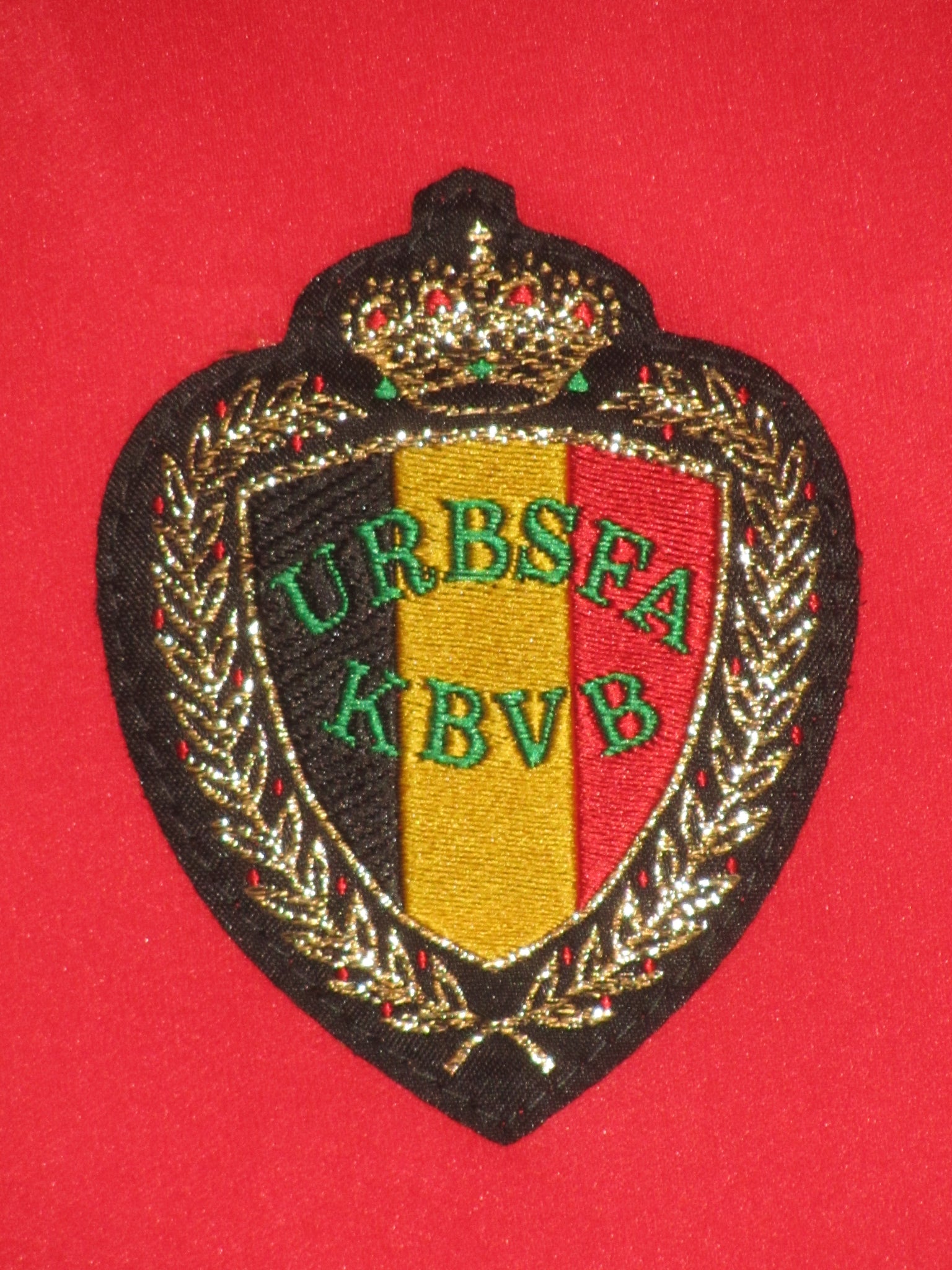 Het geborduurde KBVB embleem is opgenaaid. De Diadora vermelding is in het shirt geborduurd.