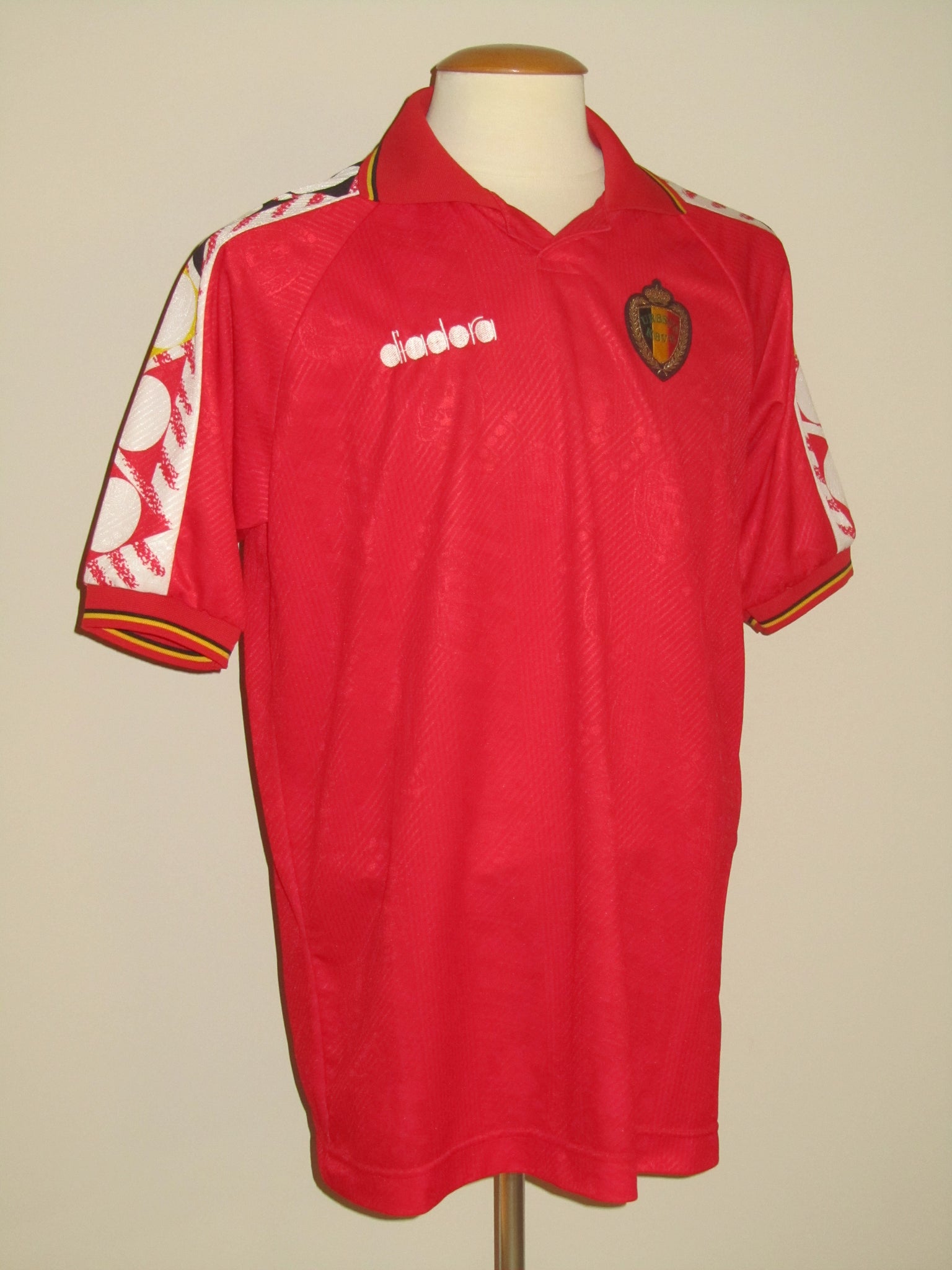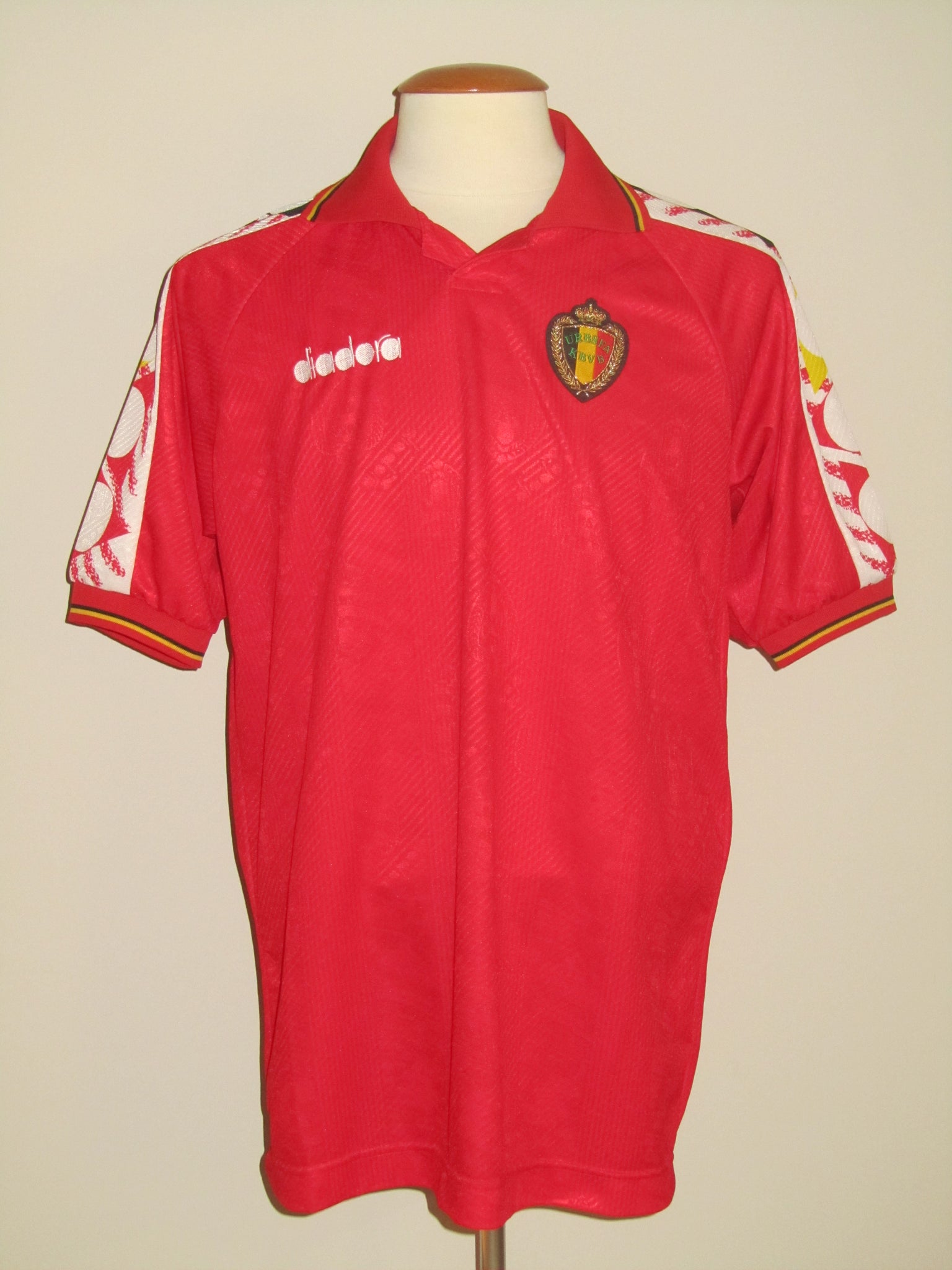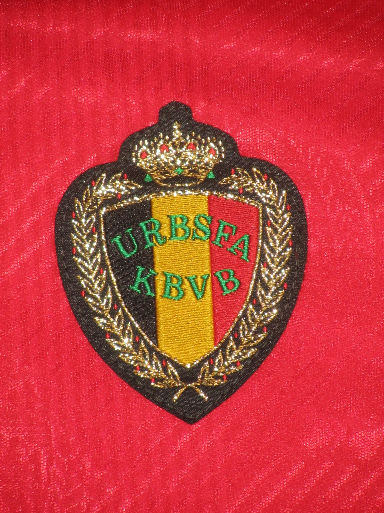 Het geborduurde KBVB embleem is opgenaaid. De Diadora vermelding is in het shirt geborduurd.
