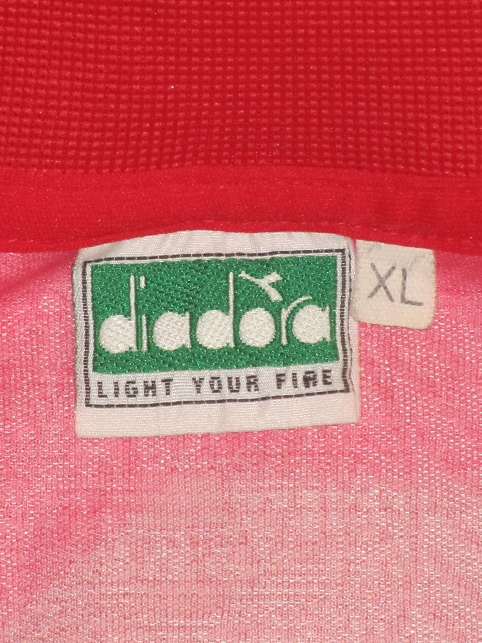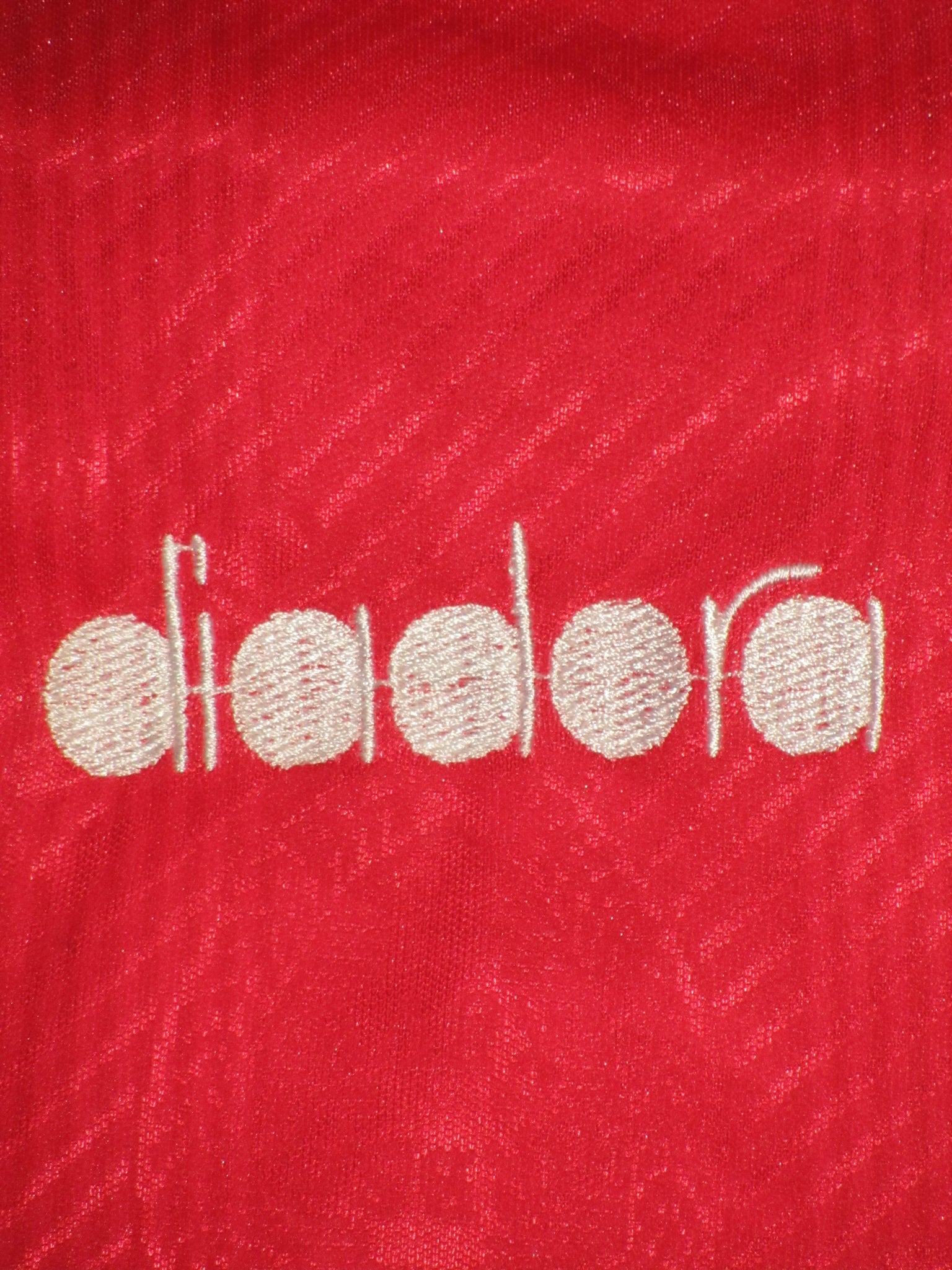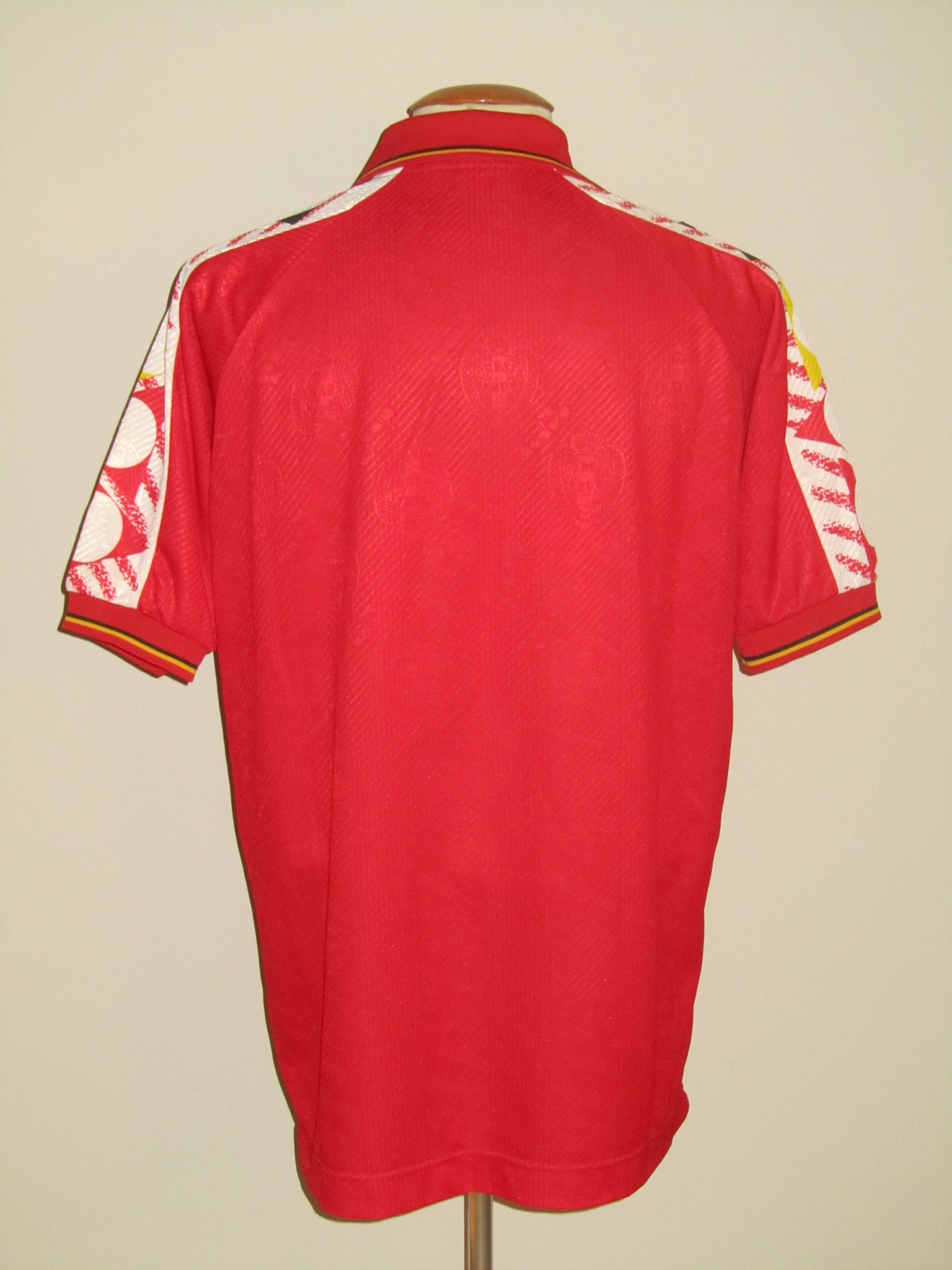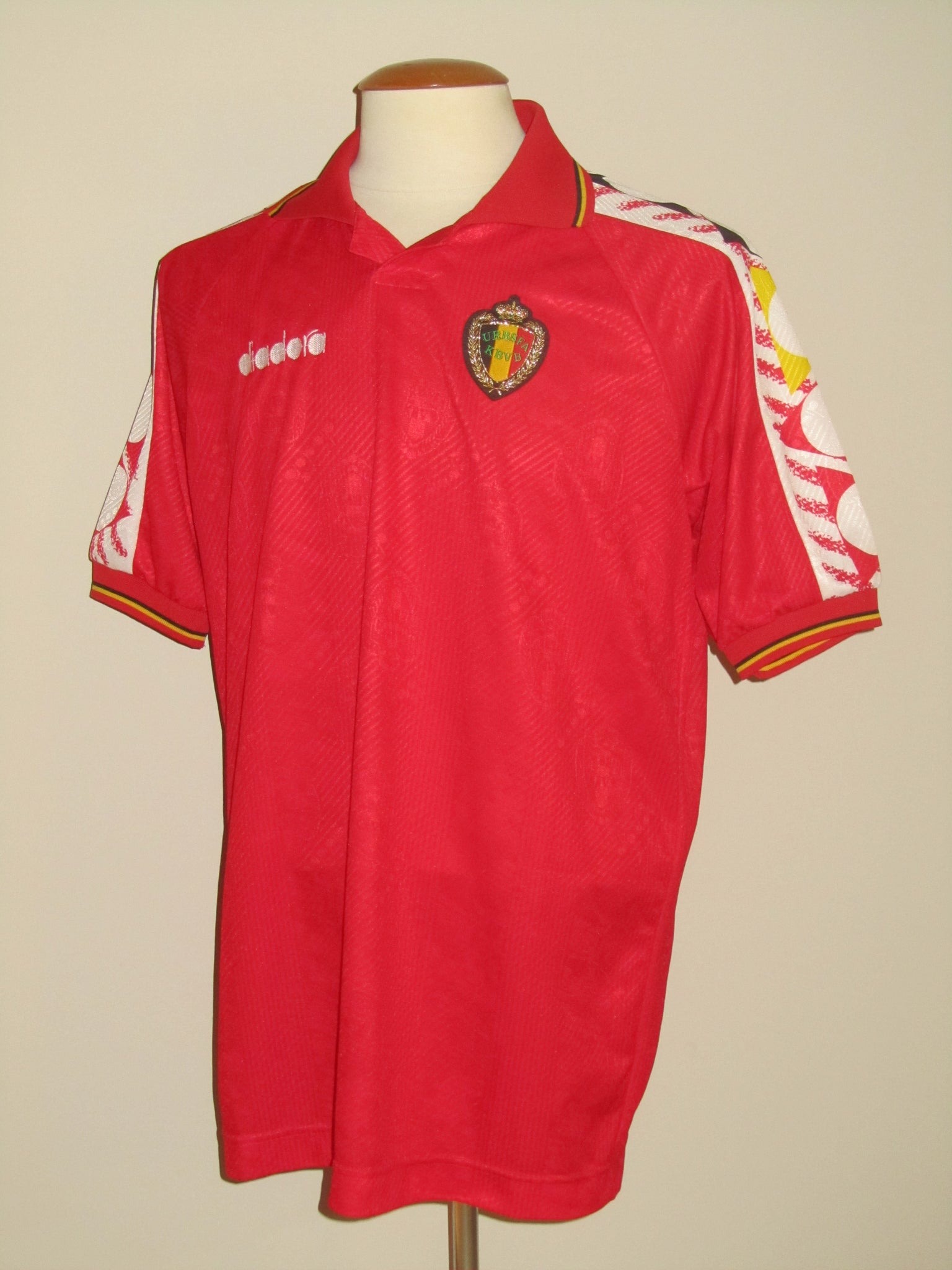 Het geborduurde KBVB embleem is opgenaaid. De Diadora vermelding is in het shirt geborduurd.