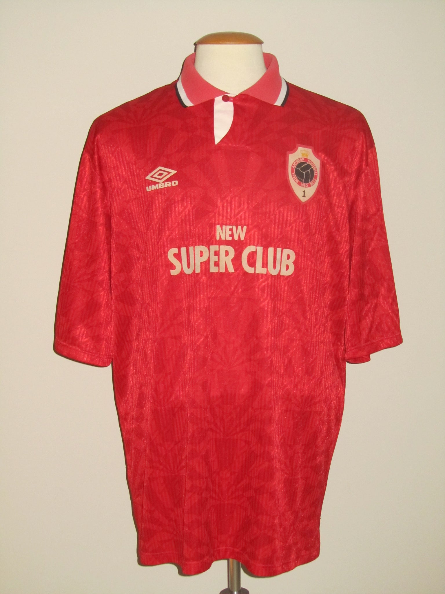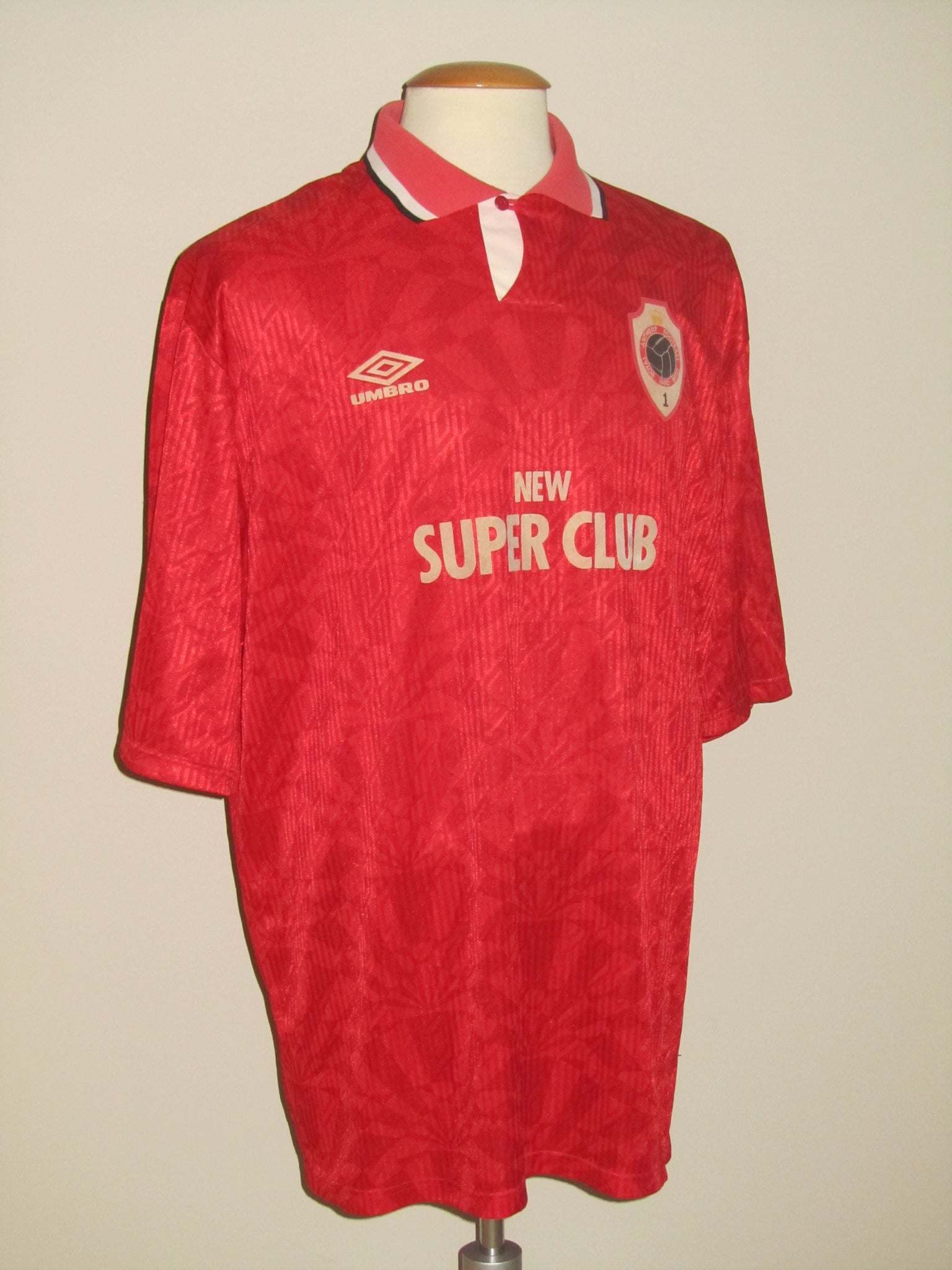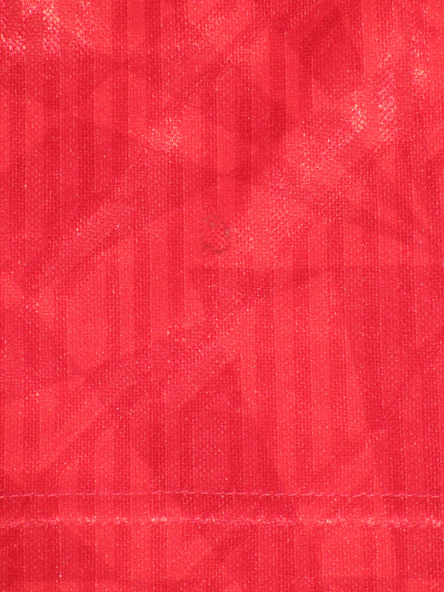 Het shirt heeft enkele zeer kleine haakjes en een gaatje van +/- 5mm aan de achterkant van de rechtermouw (zie foto). Het club embleem, het Umbro logo en de sponsor vermelding zijn velourse flockages. Het shirt materiaal heeft een felrode kleur met een fraai printpatroon met afwisselend blinkende en matte elementen. Het shirt met heat press logo is de internationale versie die anders is dan de embroided Europese versie.