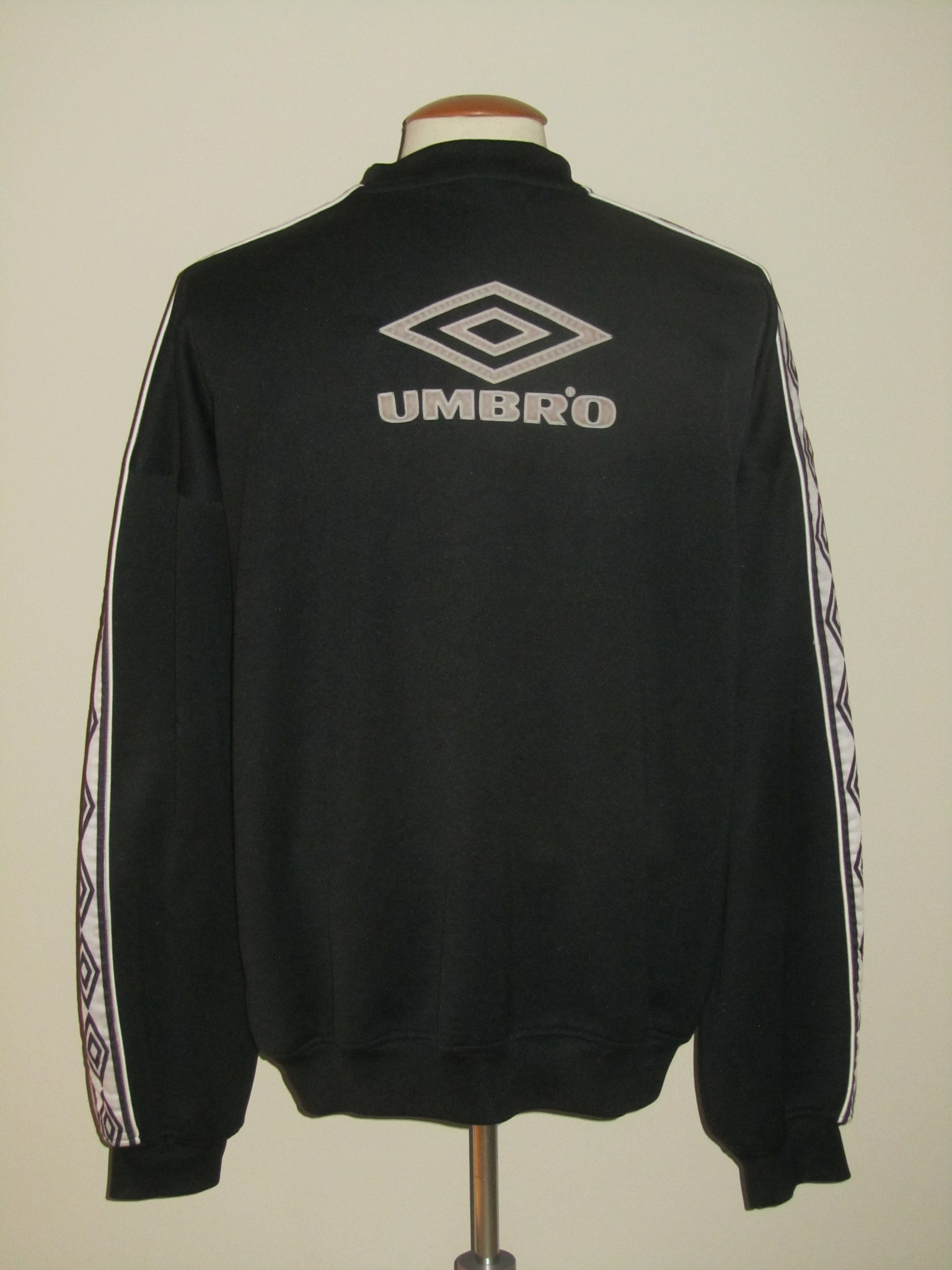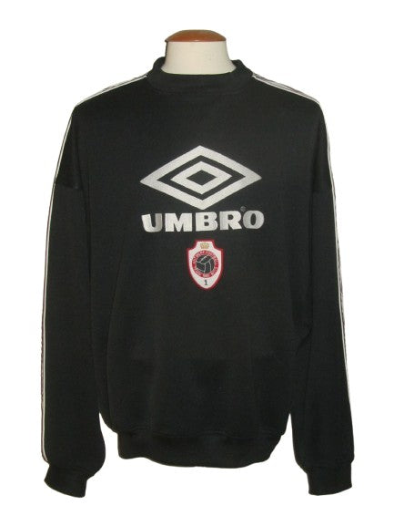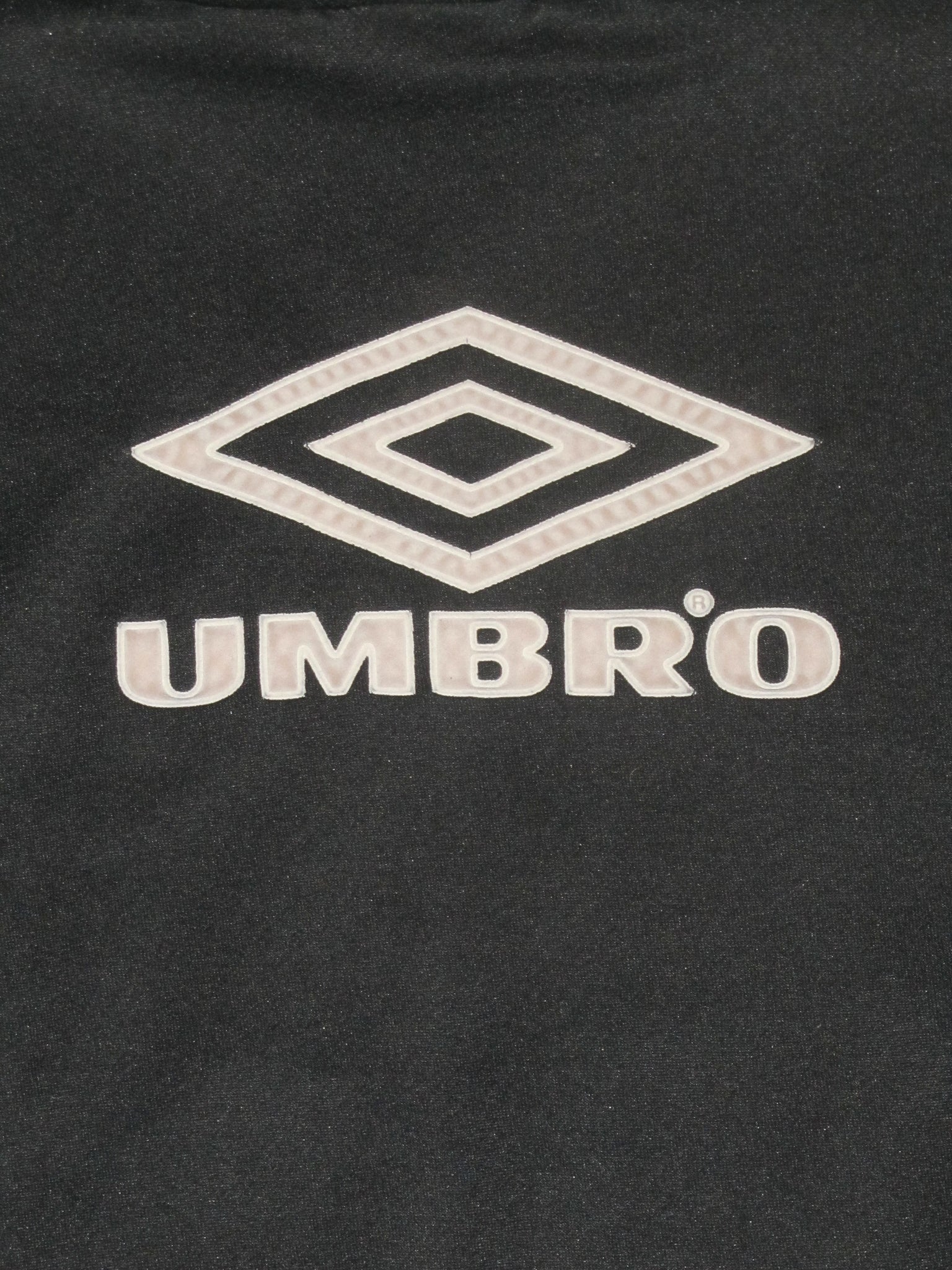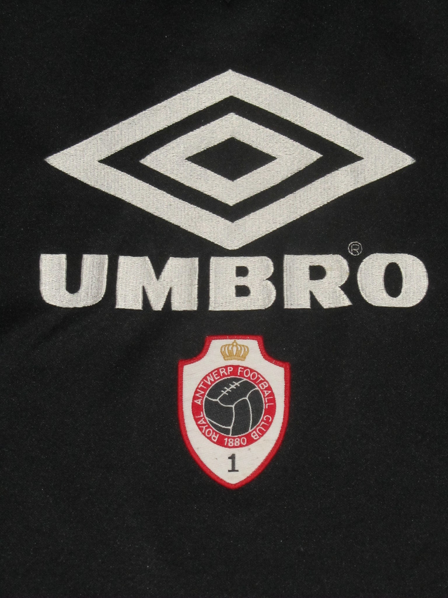 Enkele haakjes aan de achterkant van de linkermouw. Het club embleem is opgenaaid. De Umbro vermelding en het logo aan de voorzijde zijn in de sweatshirt geborduurd. Deze aan de achterzijde zijn velourse, heat pressed flockages en licht vervuild.