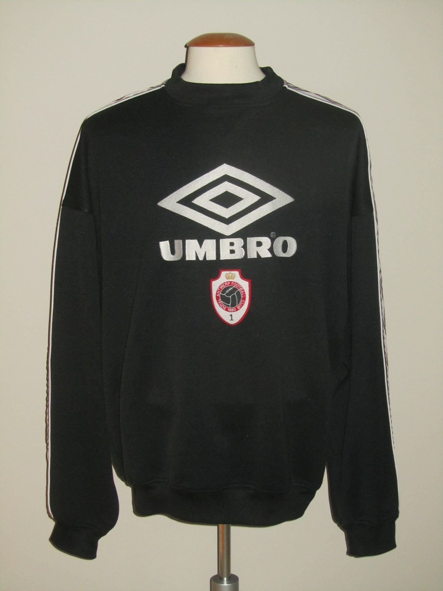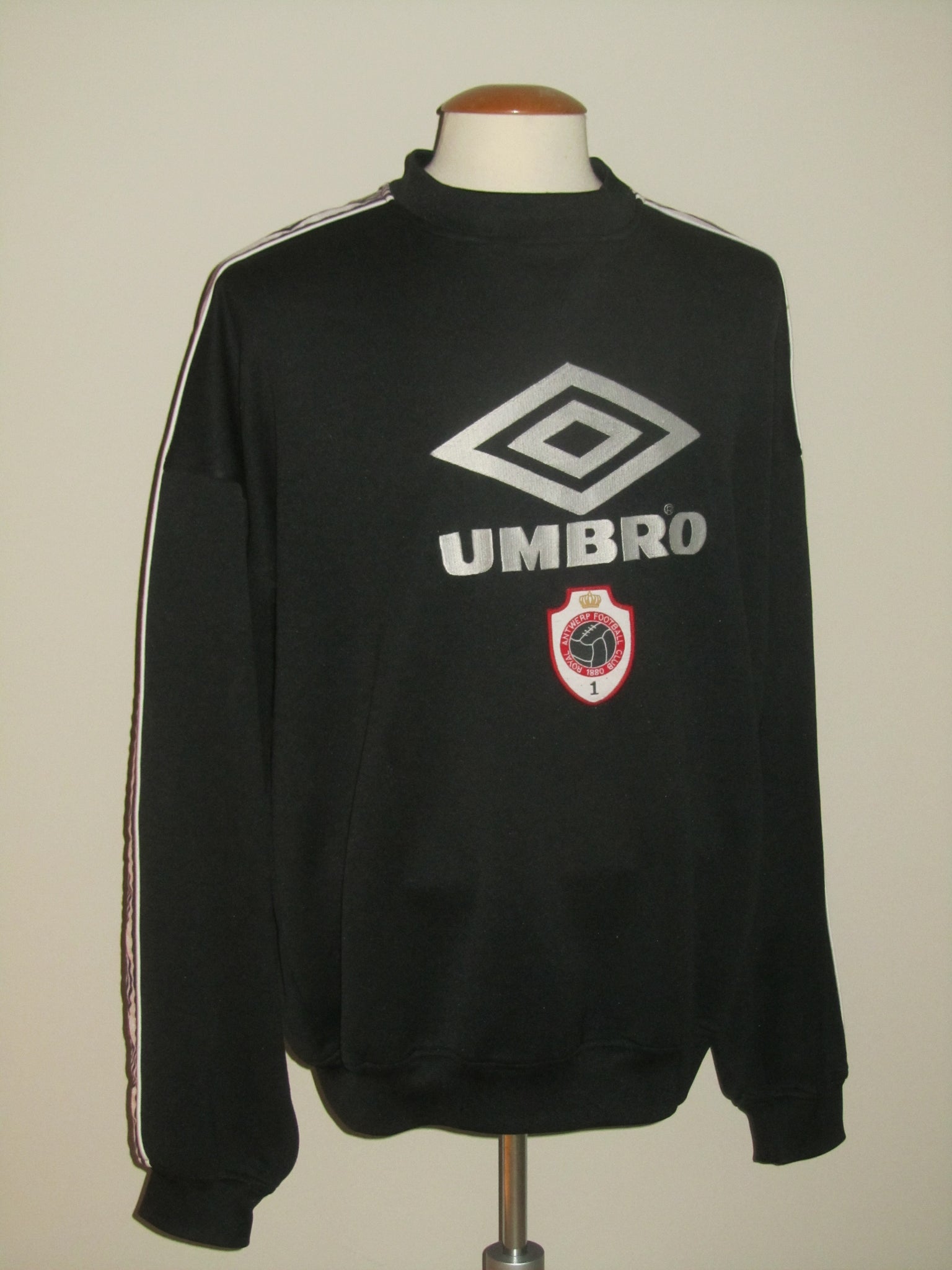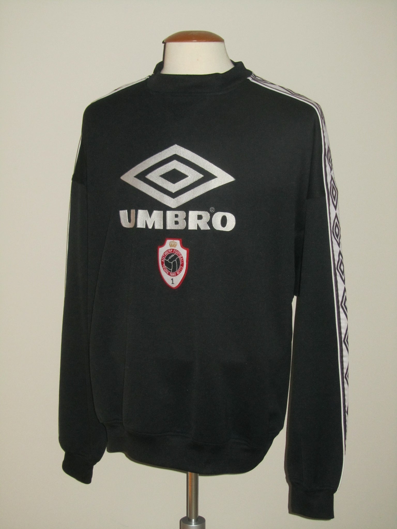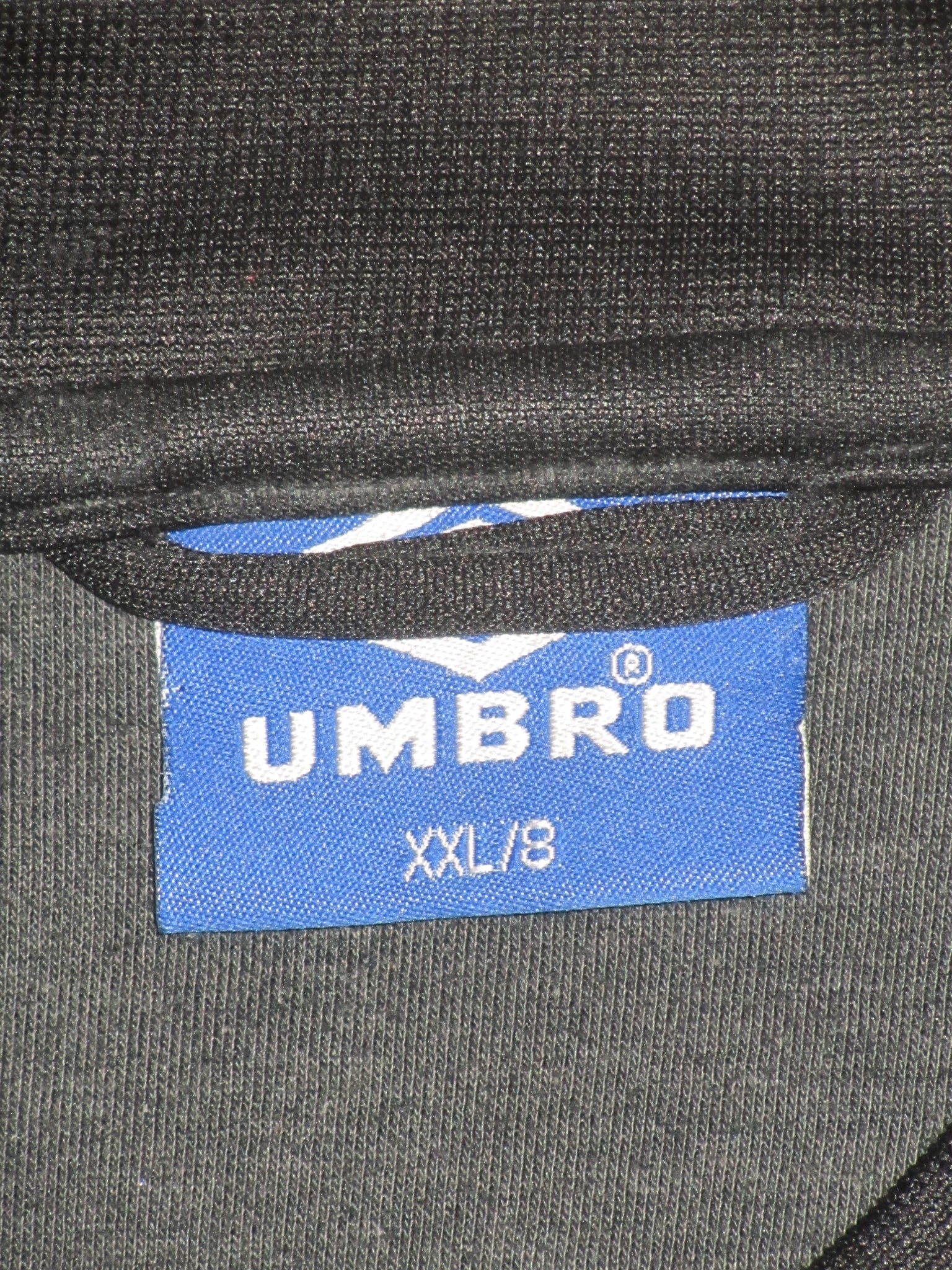 Enkele haakjes aan de achterkant van de linkermouw. Het club embleem is opgenaaid. De Umbro vermelding en het logo aan de voorzijde zijn in de sweatshirt geborduurd. Deze aan de achterzijde zijn velourse, heat pressed flockages en licht vervuild.