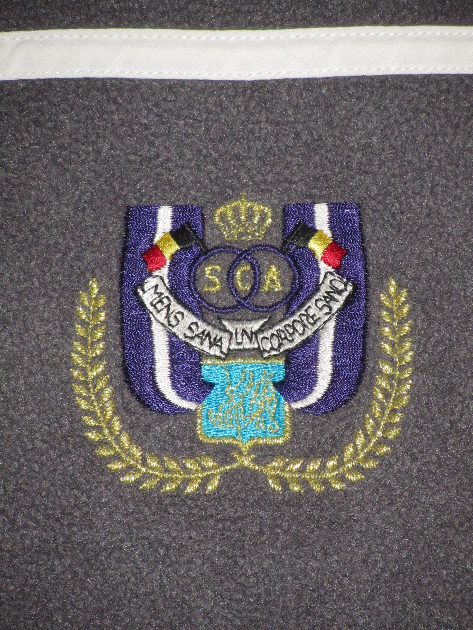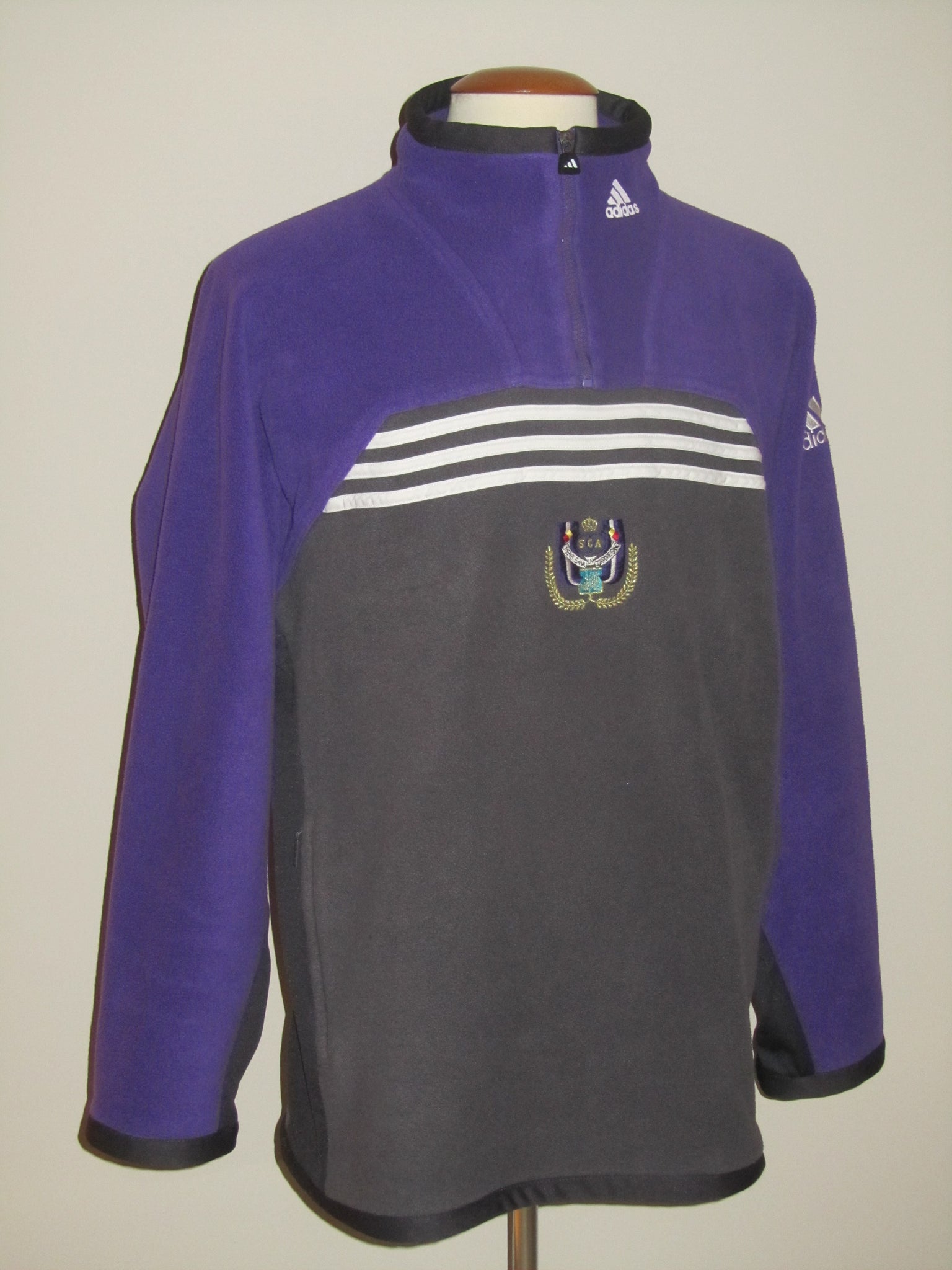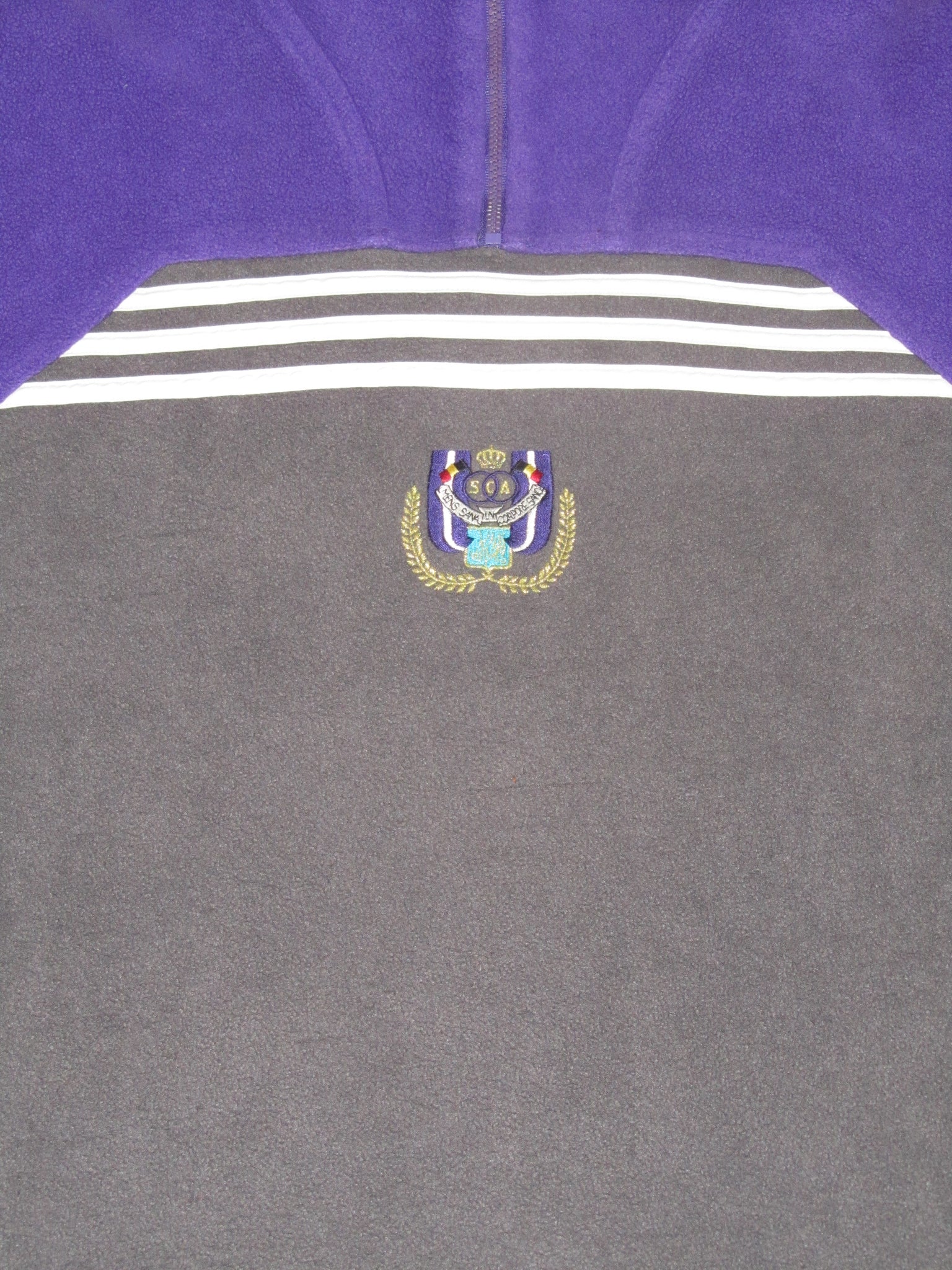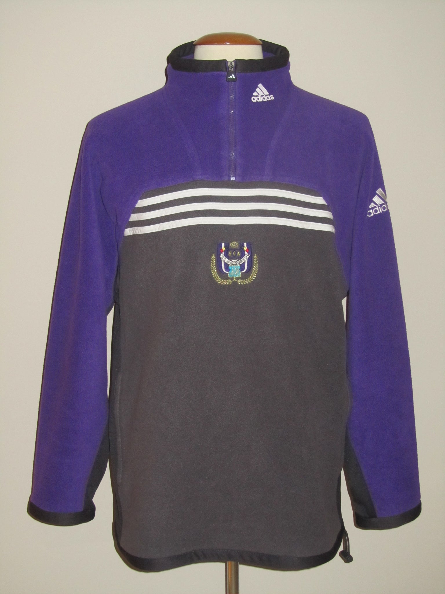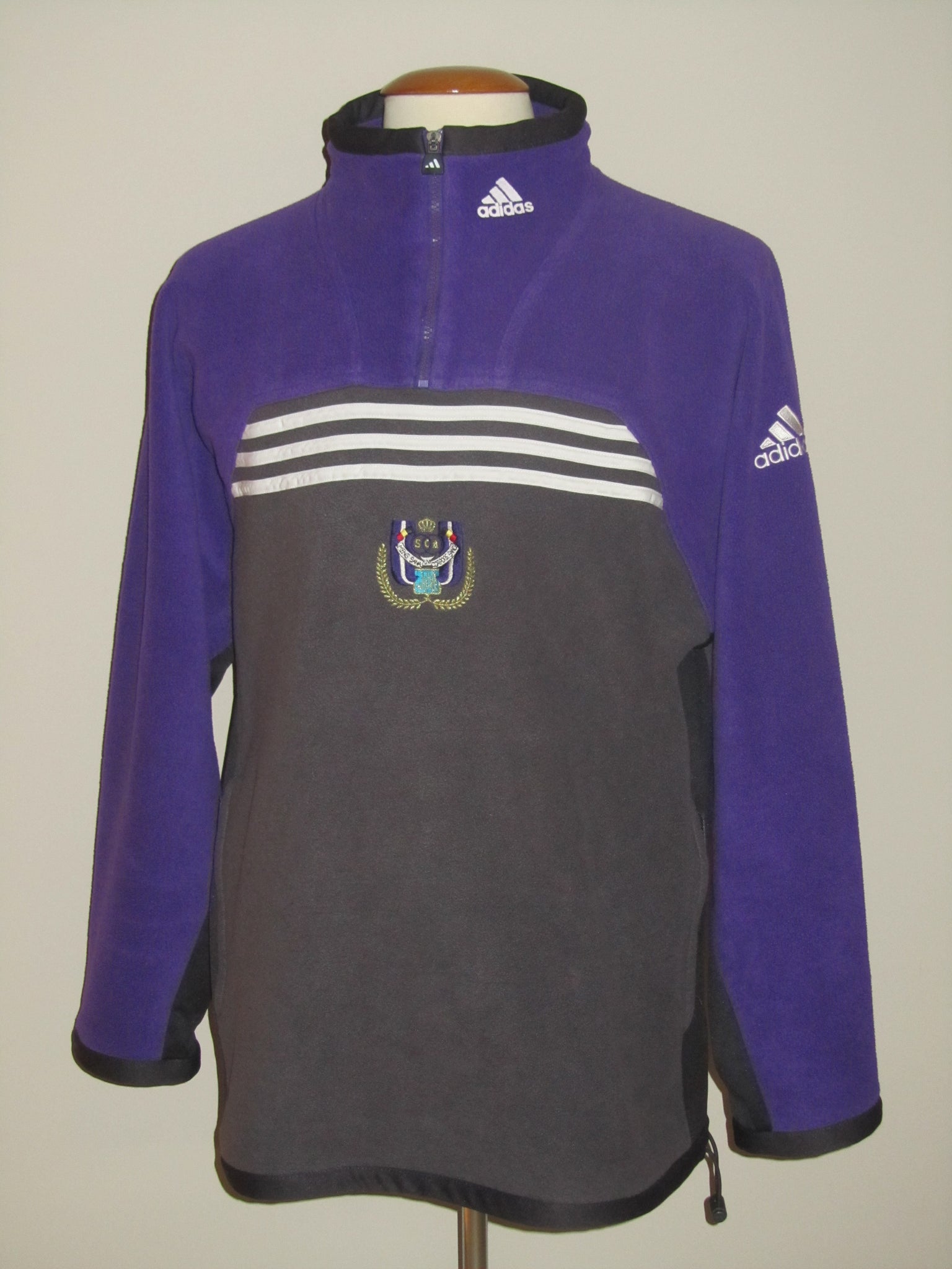 Het Adidas logo in de kraag is een plastic print. Het Adidas logo op de mouw en het club embleem zijn in de sweater geborduurd. De ritssluitingen functioneren perfect.