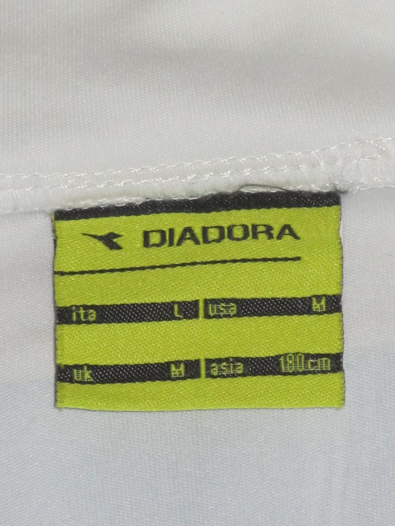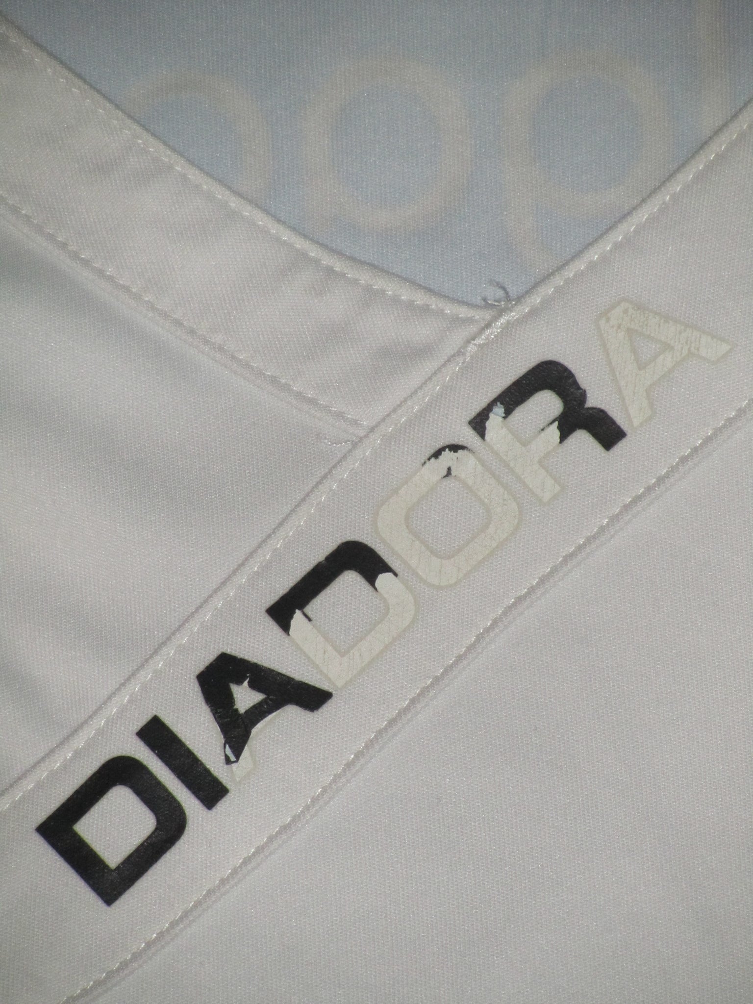 Het club embleem, de sponsor vermeldingen en de rugnummer zijn plastic heat pressed prints. De Diadora vermelding aan de hals is verweerd.