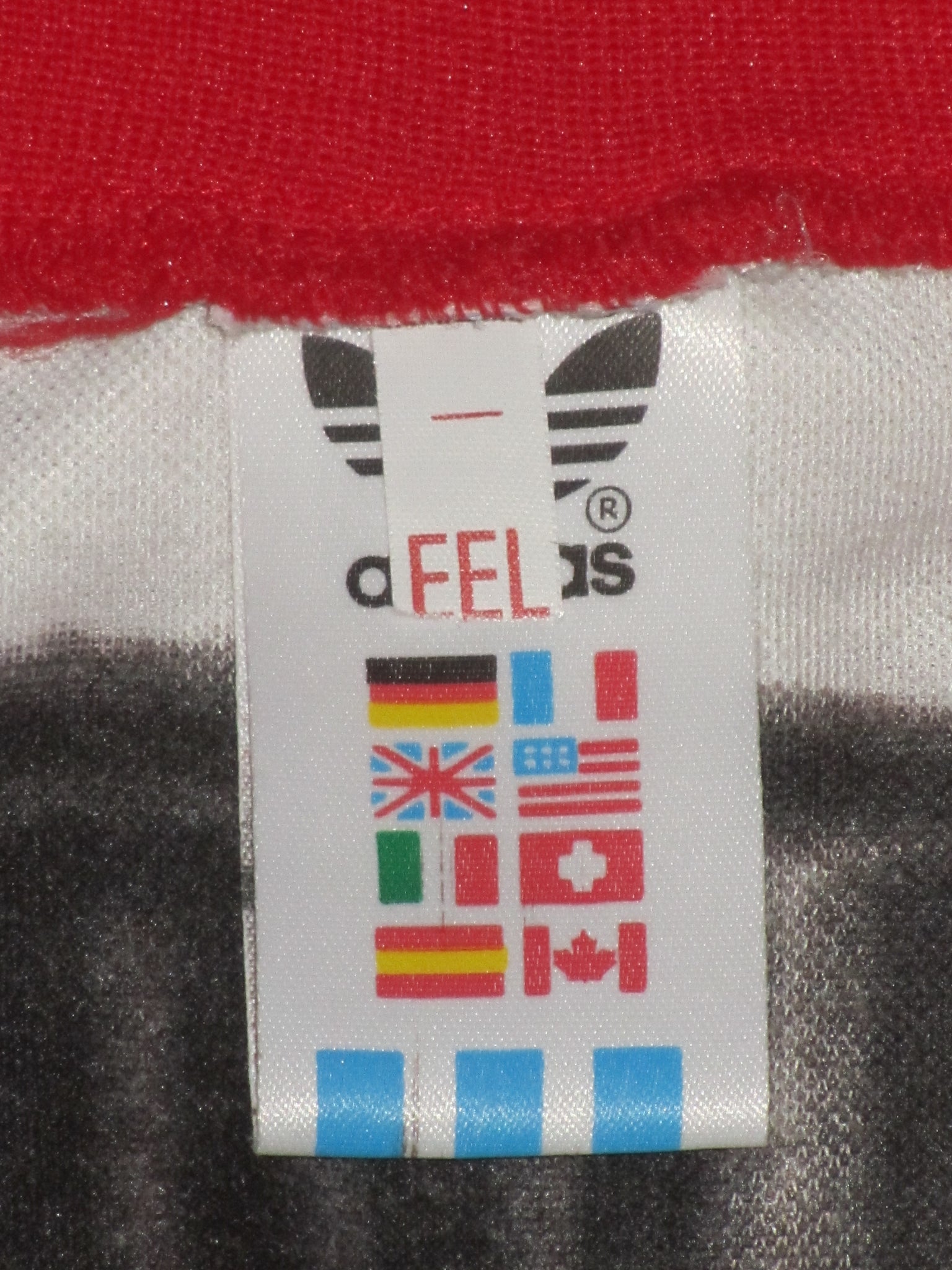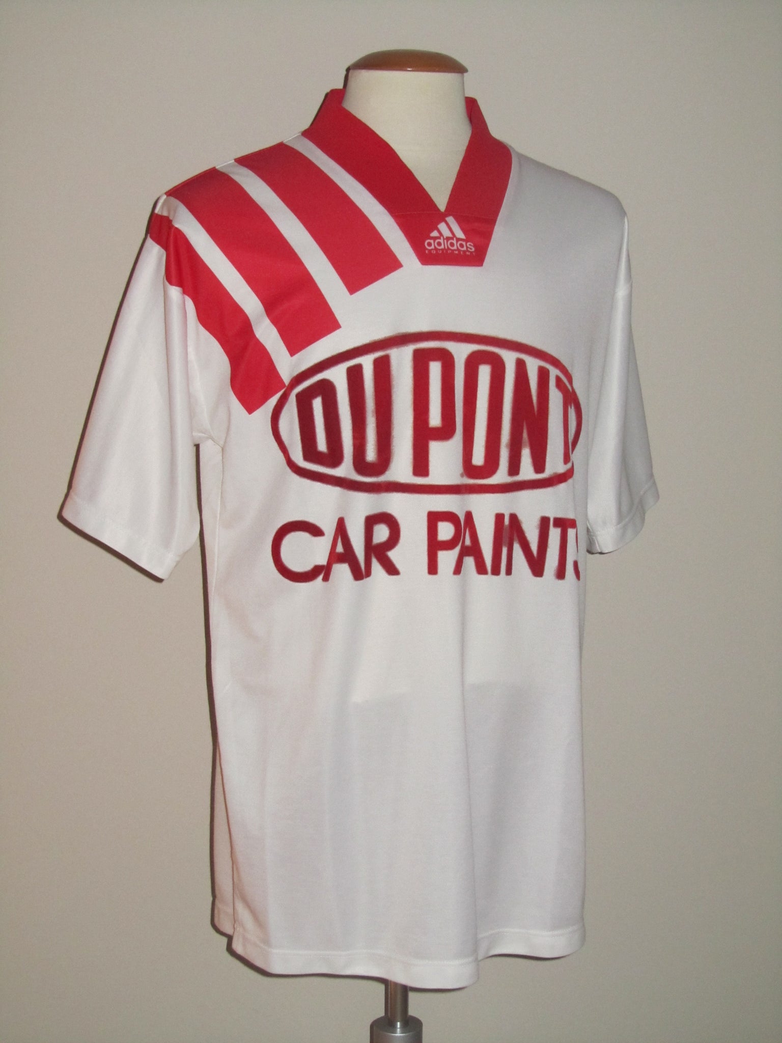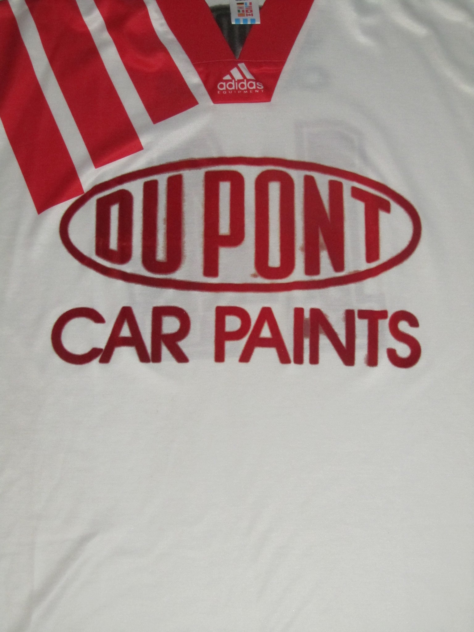 Het shirt heeft enkele zeer kleine vlekjes. De sponsor vermeldingen en de rugnummer zijn velourse heat pressed flockages, waarvan de kleur is "uitgelopen" in het shirt.