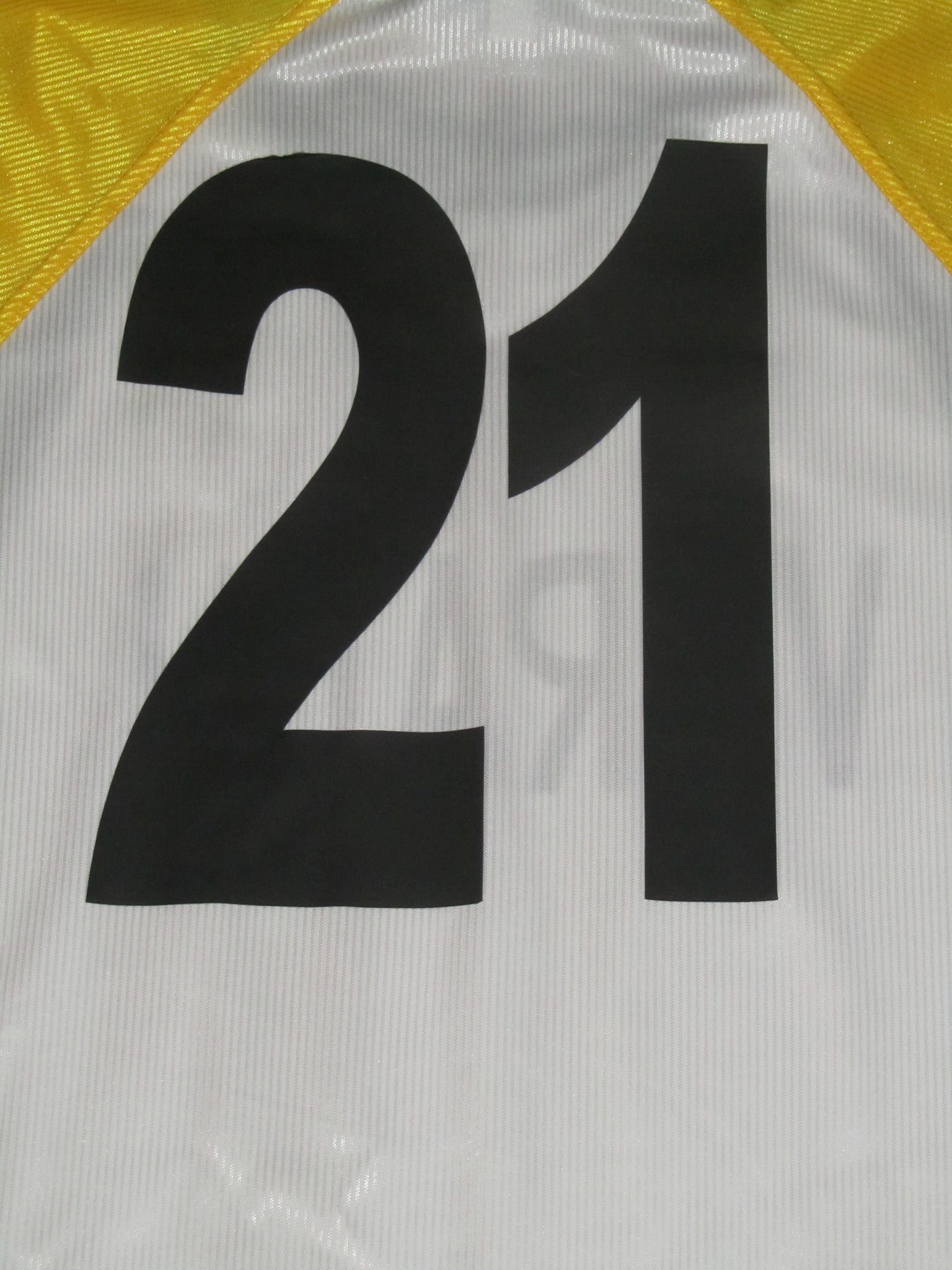 Het geborduurde club embleem is opgenaaid. De Garman vermelding is een velourse flockage. De Veralu vermelding is in het shirt geprint. De rugnummer is een plastic heat pressed print.