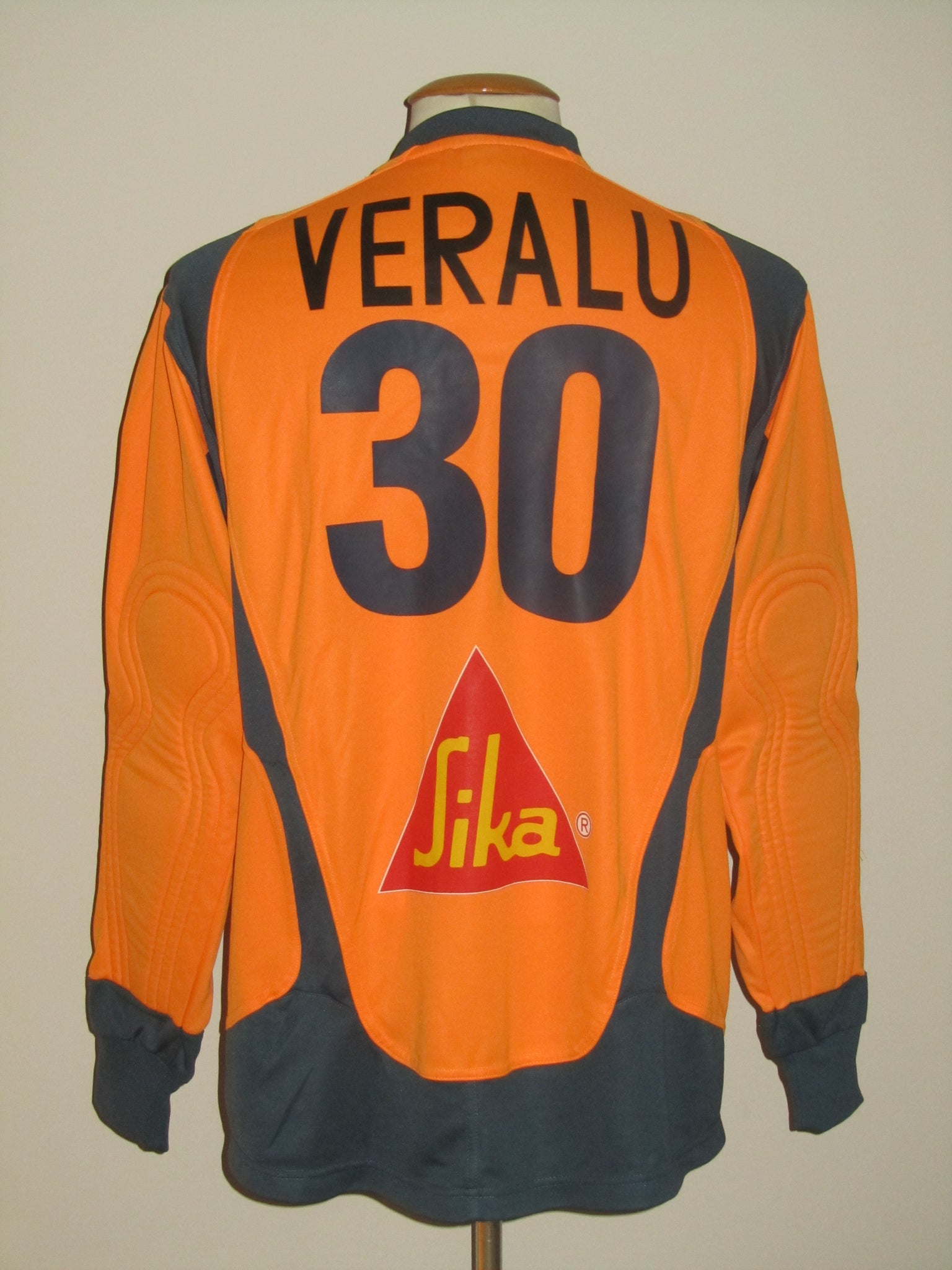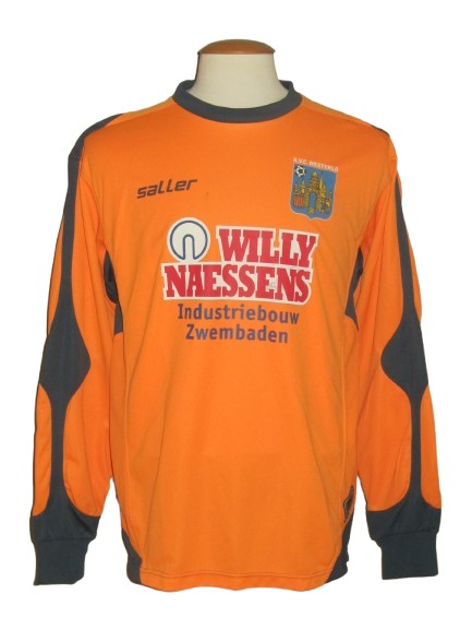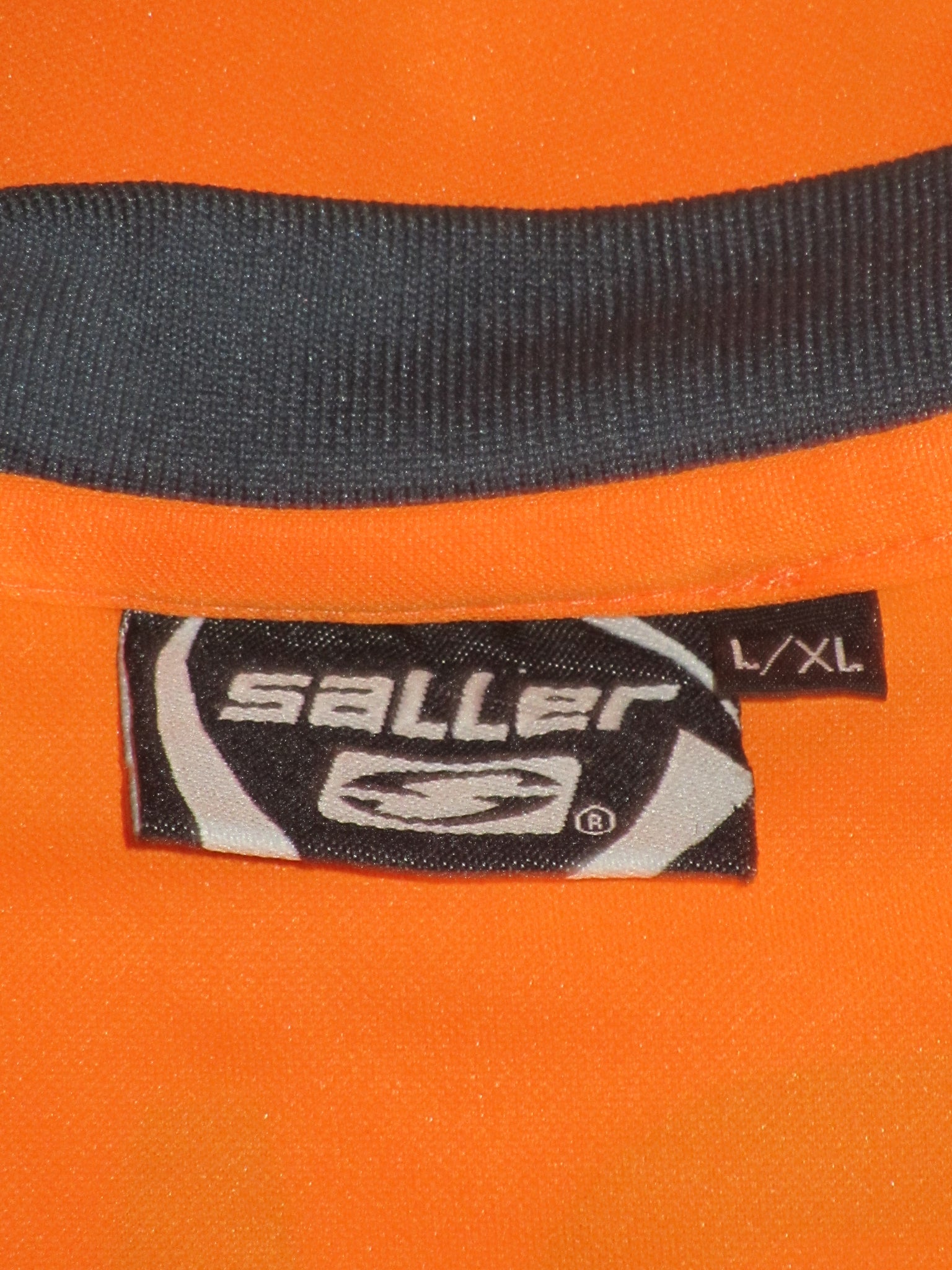 Het shirt heeft lichte (wedstrijd?) vlekken. Het club embleem en de Saller vermelding zijn velourse flockages. De sponsorvermeldingen en de rugnummer zijn plastic heat pressed prints.