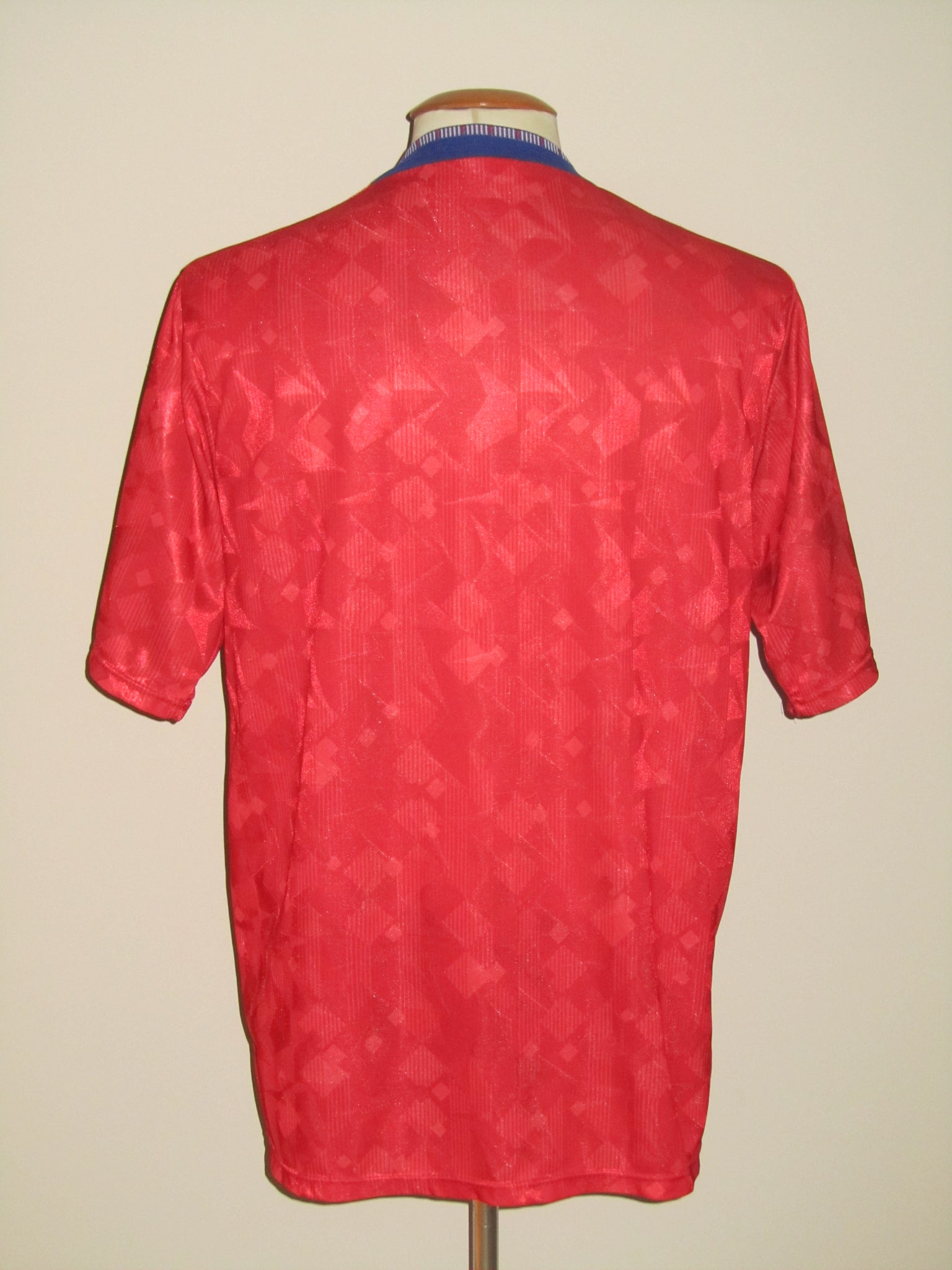 The Umbro logo and the club crest are velvet heat pressed prints. The shirt has nice colours and a print pattern.