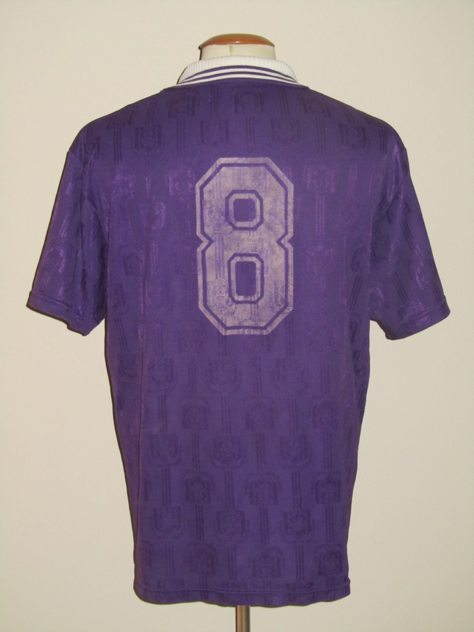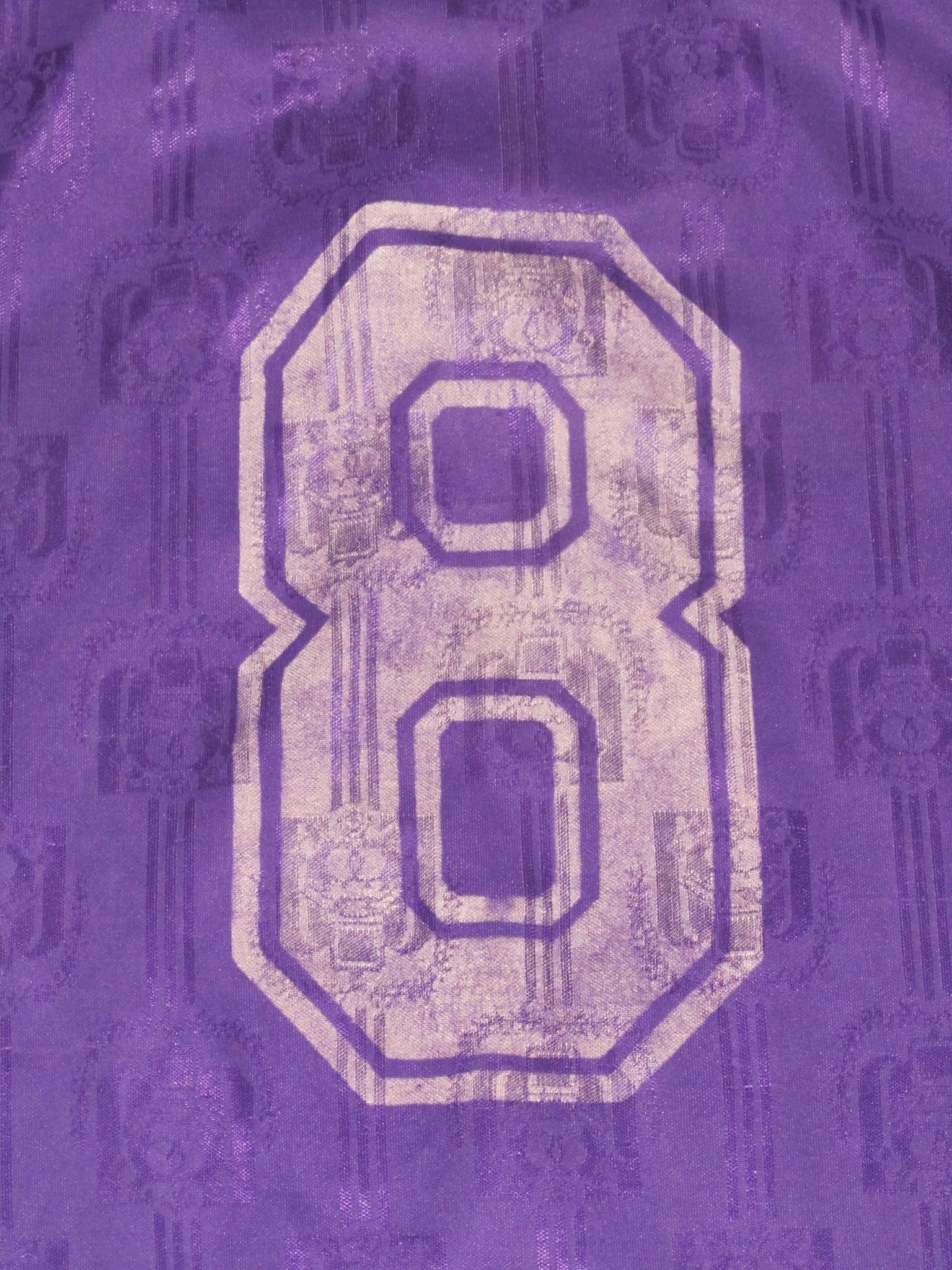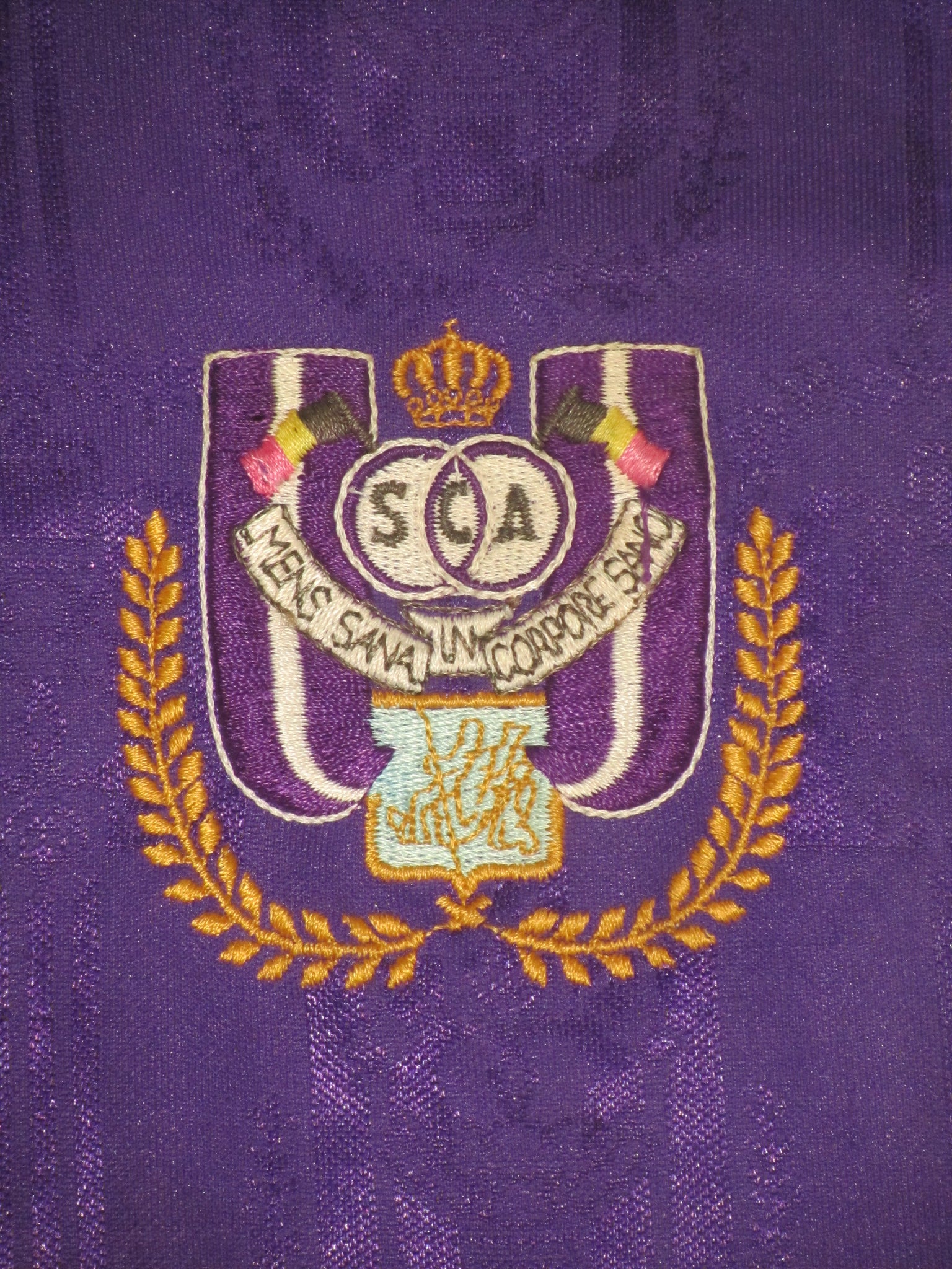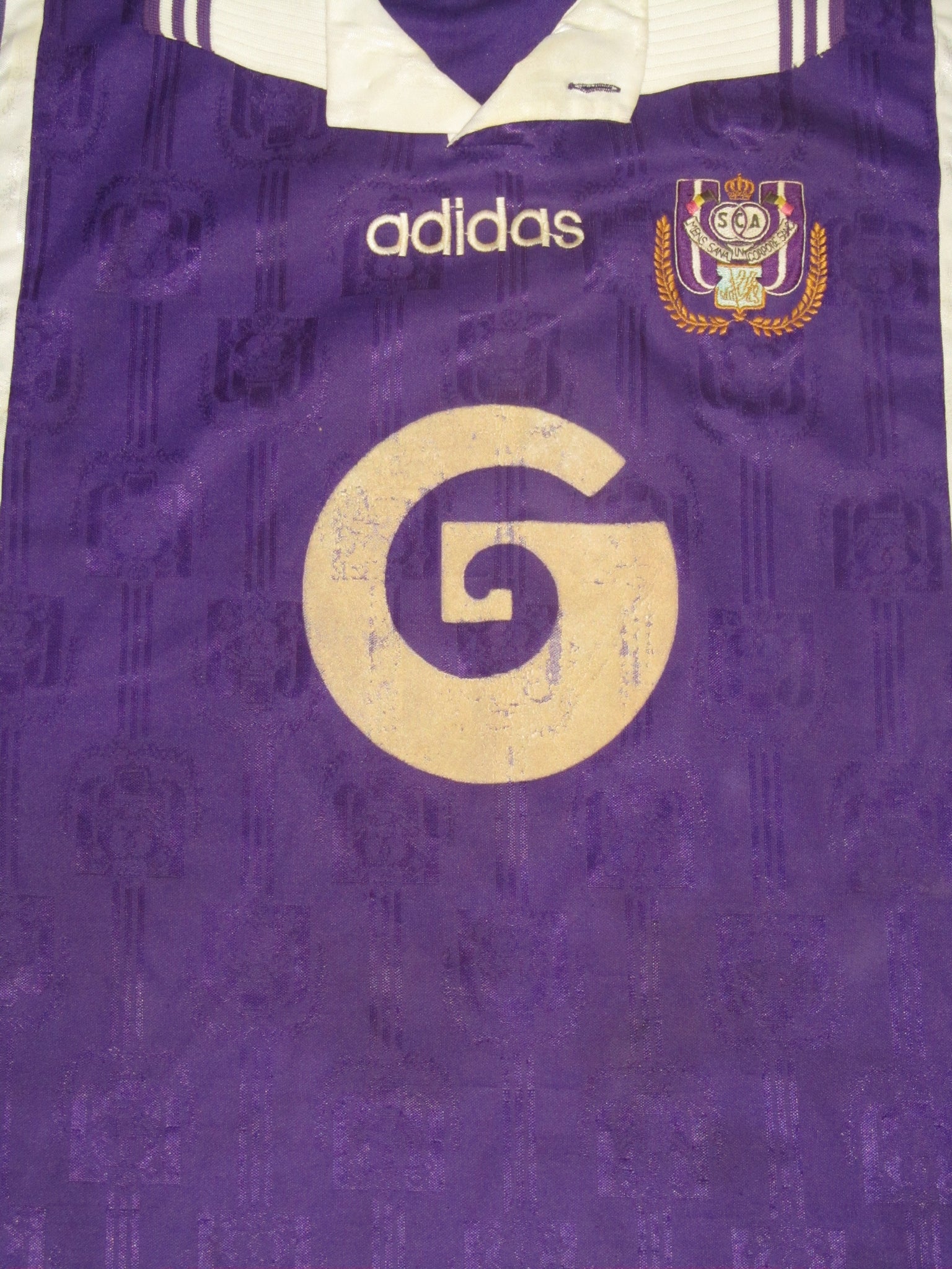 Het shirt heeft kleine haakjes. De knoop van de halssluiting ontbreekt. De Adidas vermelding en het club embleem zijn in het shirt geborduurd. Het sponsor logo en de rugnummer zijn velourse flockages en verweerd. Het velourse van de rugnummer is verdwenen, enkel de afdruk is zichtbaar. De RSCA garment label is opgenaaid. Het shirt heeft een mooi print patroon met daarin een subtiele verwerking van het club embleem.