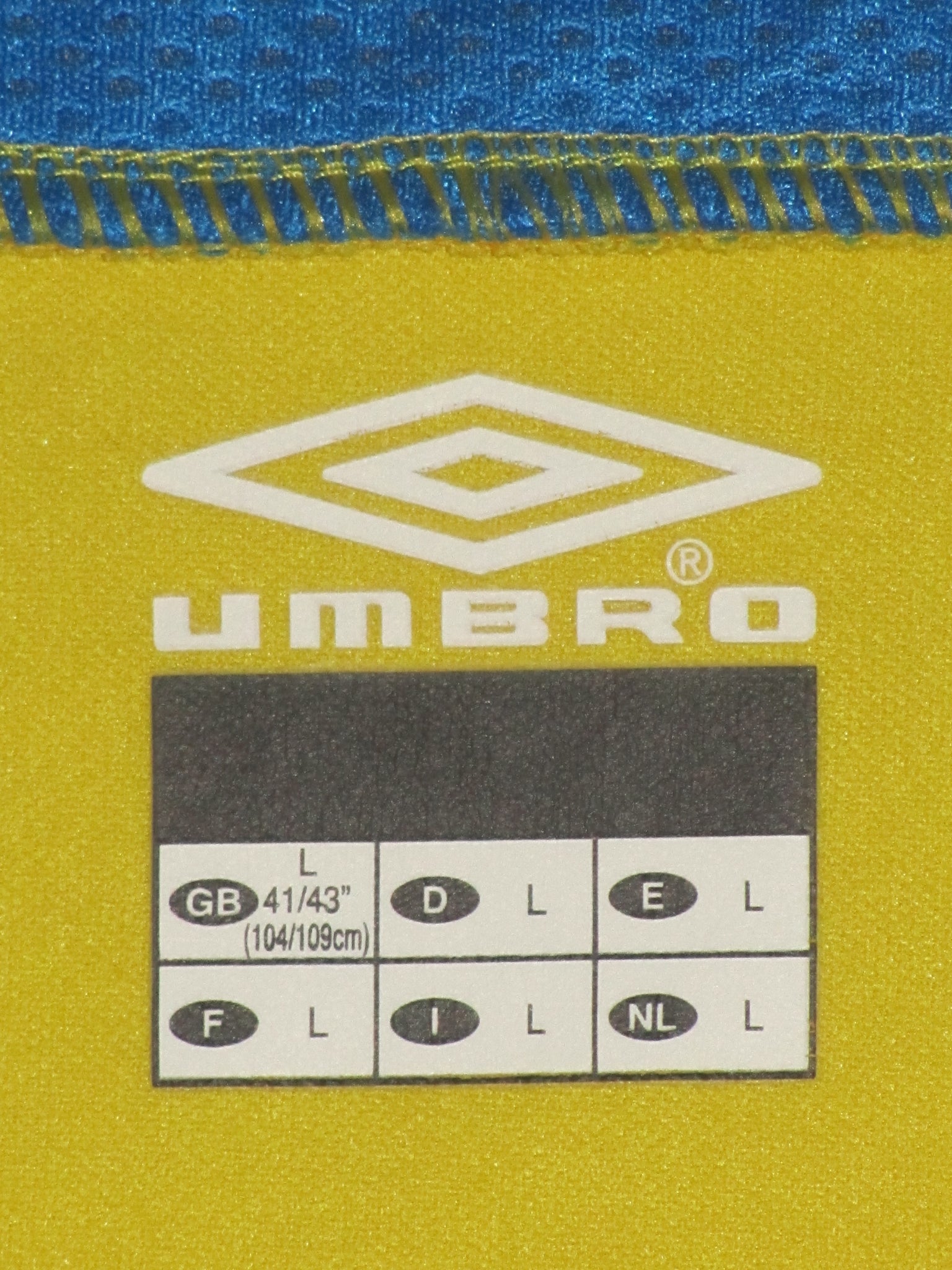 Enkele zeer kleine haakjes. Het club embleem, de sponsor vermeldingen en de rugnummer zijn plastic heat pressed prints. De Umbro logo's zijn velourse bedrukkingen.